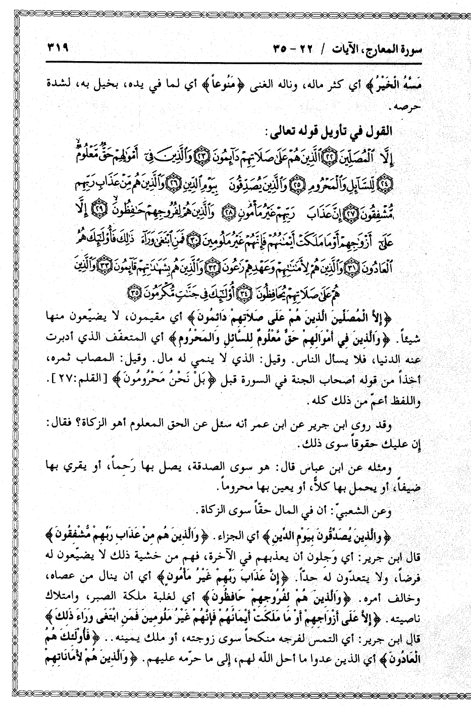 إِلَّا الْمُصَلِّينَ الَّذِينَ هُمْ عَلى صَلاتِهِمْ دائِمُونَ أي مقيمون، لا يضيّعون منها شيئا. وَالَّذِينَ فِي أَمْوالِهِمْ حَقٌّ مَعْلُومٌ لِلسَّائِلِ وَالْمَحْرُومِ أي المتعفّف الذي أدبرت عنه الدنيا، فلا يسأل الناس. وقيل: الذي لا ينمي له مال. وقيل: المصاب ثمره، أخذا من قوله أصحاب الجنة في السورة قبل بَلْ نَحْنُ مَحْرُومُونَ [القلم: 27] .