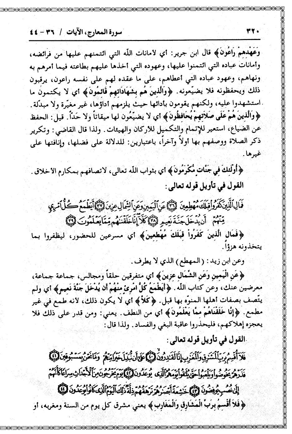 عَنِ الْيَمِينِ وَعَنِ الشِّمالِ عِزِينَ أي متفرقين حلقا ومجالس، جماعة جماعة، معرضين عنك، وعن كتاب الله. أَيَطْمَعُ كُلُّ امْرِئٍ مِنْهُمْ أَنْ يُدْخَلَ جَنَّةَ نَعِيمٍ أي ولم يتّصف بصفات أهلها المنوّه بها قبل. كَلَّا أي لا يكون ذلك، لأنه طمع في غير مطمع. إِنَّا خَلَقْناهُمْ مِمَّا يَعْلَمُونَ أي من النطف. يعني: ومن قدر على ذلك فلا يعجزه إهلاكهم، فليحذروا عاقبة البغي والفساد. ولذا قال: