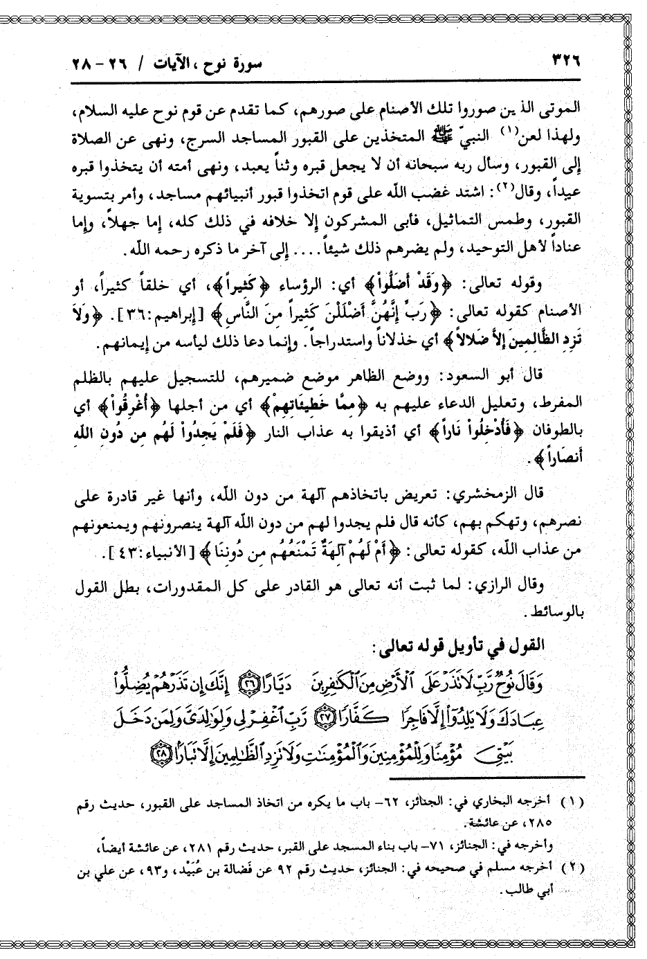 وَقالَ نُوحٌ رَبِّ لا تَذَرْ عَلَى الْأَرْضِ مِنَ الْكافِرِينَ دَيَّاراً (26) إِنَّكَ إِنْ تَذَرْهُمْ يُضِلُّوا عِبادَكَ وَلا يَلِدُوا إِلاَّ فاجِراً كَفَّاراً (27) رَبِّ اغْفِرْ لِي وَلِوالِدَيَّ وَلِمَنْ دَخَلَ بَيْتِيَ مُؤْمِناً وَلِلْمُؤْمِنِينَ وَالْمُؤْمِناتِ وَلا تَزِدِ الظَّالِمِينَ إِلاَّ تَباراً (28)