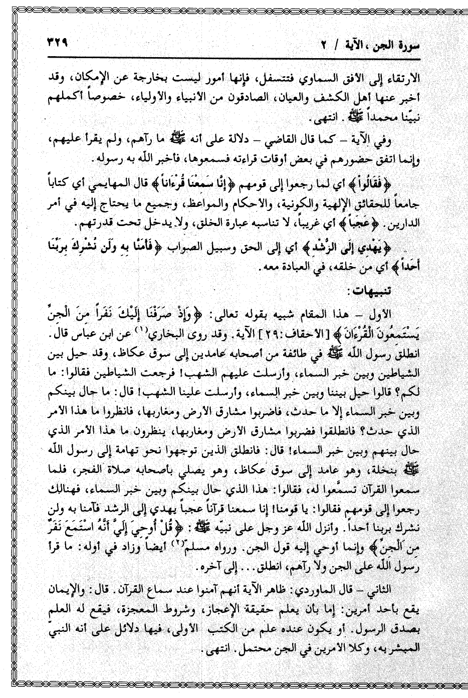 انطلق رسول الله صلّى الله عليه وسلم في طائفة من أصحابه عامدين إلى سوق عكاظ، وقد حيل بين الشياطين وبين خبر السماء، وأرسلت عليهم الشهب! فرجعت الشياطين فقالوا: ما لكم؟ قالوا حيل بيننا وبين خبر السماء، وأرسلت علينا الشهب! قال: ما حال بينكم وبين خبر السماء إلا ما حدث، فاضربوا مشارق الأرض ومغاربها، فانظروا ما هذا الأمر الذي حدث؟ فانطلقوا فضربوا مشارق الأرض ومغاربها، ينظرون ما هذا الأمر الذي حال بينهم وبين خبر السماء! قال: فانطلق الذين توجهوا نحو تهامة إلى رسول الله صلّى الله عليه وسلم بنخلة، وهو عامد إلى سوق عكاظ، وهو يصلي بأصحابه صلاة الفجر، فلما سمعوا القرآن تسمّعوا له، فقالوا: هذا الذي حال بينكم وبين خبر السماء، فهنالك رجعوا إلى قومهم فقالوا: يا قومنا! إنا سمعنا قرآنا عجبا يهدي إلى الرشد فآمنا به ولن نشرك بربنا أحدا. وأنزل الله عز وجل على نبيّه صلّى الله عليه وسلم: قُلْ أُوحِيَ إِلَيَّ أَنَّهُ اسْتَمَعَ نَفَرٌ مِنَ الْجِنِّ وإنما أوحي إليه قول الجن. ورواه مسلّم أيضا وزاد في أوله: ما قرأ رسول الله على الجن ولا رآهم، انطلق ... إلى آخره.