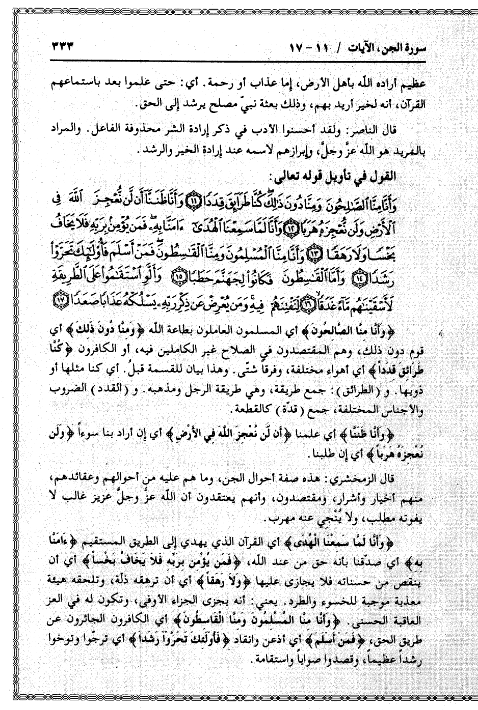 وَأَنَّا مِنَّا الصَّالِحُونَ وَمِنَّا دُونَ ذلِكَ كُنَّا طَرائِقَ قِدَداً (11) وَأَنَّا ظَنَنَّا أَنْ لَنْ نُعْجِزَ اللَّهَ فِي الْأَرْضِ وَلَنْ نُعْجِزَهُ هَرَباً (12) وَأَنَّا لَمَّا سَمِعْنَا الْهُدى آمَنَّا بِهِ فَمَنْ يُؤْمِنْ بِرَبِّهِ فَلا يَخافُ بَخْساً وَلا رَهَقاً (13) وَأَنَّا مِنَّا الْمُسْلِمُونَ وَمِنَّا الْقاسِطُونَ فَمَنْ أَسْلَمَ فَأُولئِكَ تَحَرَّوْا رَشَداً (14) وَأَمَّا الْقاسِطُونَ فَكانُوا لِجَهَنَّمَ حَطَباً (15)
