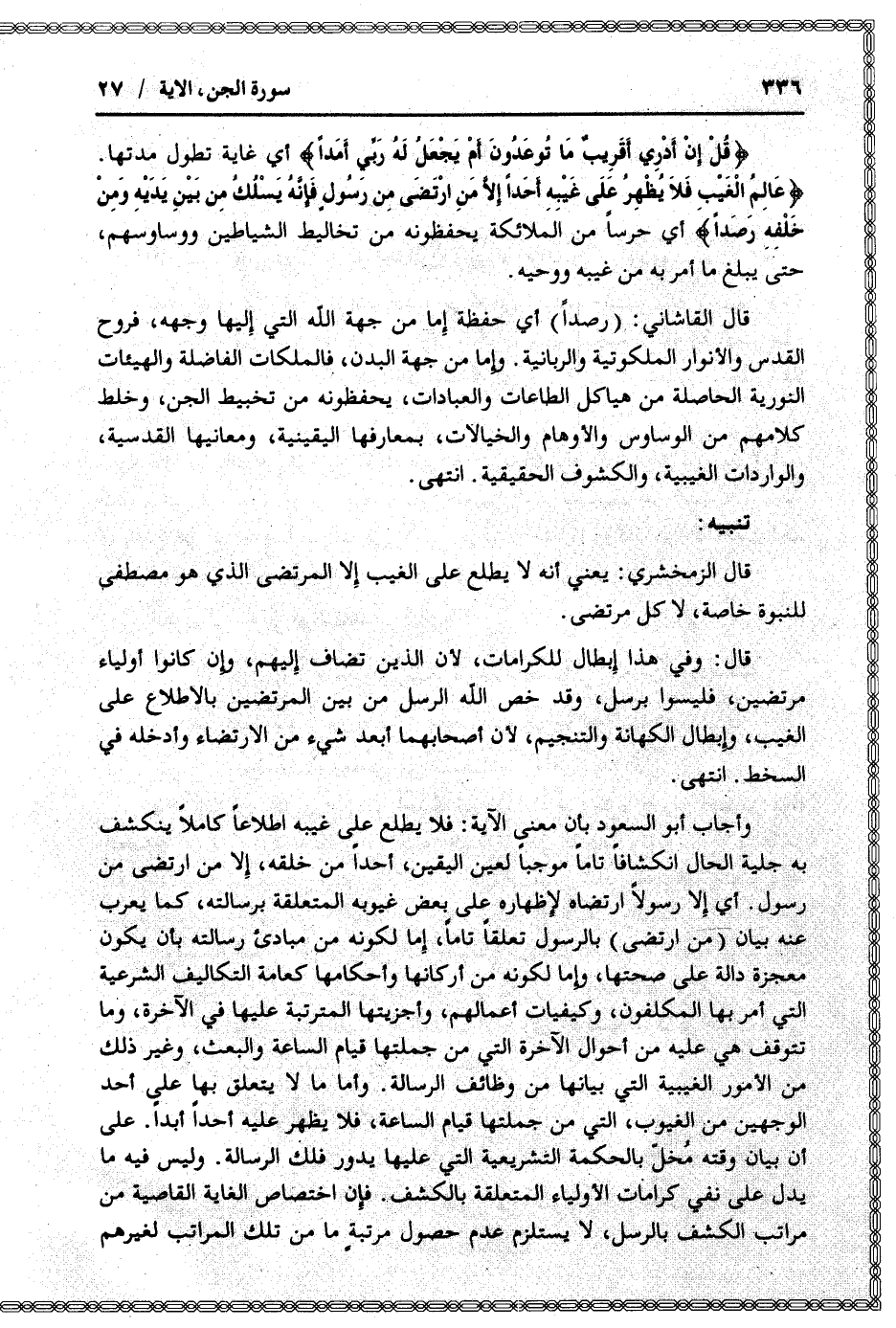 وأجاب أبو السعود بأن معنى الآية: فلا يطلع على غيبه اطلاعا كاملا ينكشف به جلية الحال انكشافا تاما موجبا لعين اليقين، أحدا من خلقه، إلا من ارتضى من رسول. أي إلا رسولا ارتضاه لإظهاره على بعض غيوبه المتعلقة برسالته، كما يعرب عنه بيان (من ارتضى) بالرسول تعلقا تاما، إما لكونه من مبادئ رسالته بأن يكون معجزة دالة على صحتها، وإما لكونه من أركانها وأحكامها كعامة التكاليف الشرعية التي أمر بها المكلفون، وكيفيات أعمالهم، وأجزيتها المترتبة عليها في الآخرة، وما تتوقف هي عليه من أحوال الآخرة التي من جملتها قيام الساعة والبعث، وغير ذلك من الأمور الغيبية التي بيانها من وظائف الرسالة. وأما ما لا يتعلق بها على أحد الوجهين من الغيوب، التي من جملتها قيام الساعة، فلا يظهر عليه أحدا أبدا. على أن بيان وقته مخلّ بالحكمة التشريعية التي عليها يدور فلك الرسالة. وليس فيه ما يدل على نفي كرامات الأولياء المتعلقة بالكشف. فإن اختصاص الغاية القاصية من مراتب الكشف بالرسل، لا يستلزم عدم حصول مرتبة ما من تلك المراتب لغيرهم