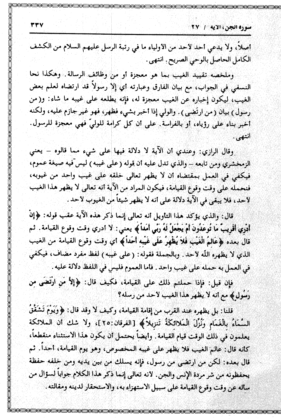 وقال الرازي: وعندي أن الآية لا دلالة فيها على شيء مما قالوه- يعني الزمخشري ومن تابعه- والذي تدل عليه أن قوله (على غيبه) ليس فيه صيغة عموم، فيكفي في العمل بمقتضاه أن لا يظهر تعالى خلقه على غيب واحد من غيوبه، فنحمله على وقت وقوع القيامة، فيكون المراد من الآية أنه تعالى لا يظهر هذا الغيب لأحد، فلا يبقى في الآية دلالة على أنه لا يظهر شيئا من الغيوب لأحد.