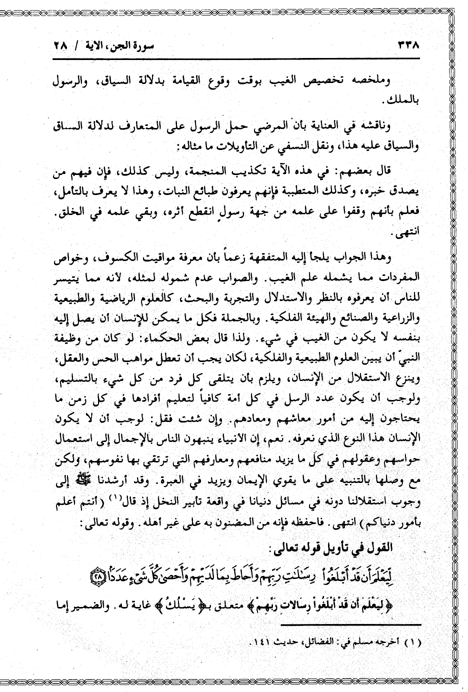 وهذا الجواب يلجأ إليه المتفقهة زعما بأن معرفة مواقيت الكسوف، وخواص المفردات مما يشمله علم الغيب. والصواب عدم شموله لمثله، لأنه مما يتيسر للناس أن يعرفوه بالنظر والاستدلال والتجربة والبحث، كالعلوم الرياضية والطبيعية والزراعية والصنائع والهيئة الفلكية. وبالجملة فكل ما يمكن للإنسان أن يصل إليه بنفسه لا يكون من الغيب في شيء. ولذا قال بعض الحكماء: لو كان من وظيفة النبيّ أن يبين العلوم الطبيعية والفلكية، لكان يجب أن تعطل مواهب الحس والعقل، وينزع الاستقلال من الإنسان، ويلزم بأن يتلقى كل فرد من كل شيء بالتسليم، ولوجب أن يكون عدد الرسل في كل أمة كافيا لتعليم أفرادها في كل زمن ما يحتاجون إليه من أمور معاشهم ومعادهم. وإن شئت فقل: لوجب أن لا يكون الإنسان هذا النوع الذي نعرفه. نعم، إن الأنبياء ينبهون الناس بالإجمال إلى استعمال حواسهم وعقولهم في كل ما يزيد منافعهم ومعارفهم التي ترتقي بها نفوسهم، ولكن مع وصلها بالتنبيه على ما يقوي الإيمان ويزيد في العبرة. وقد أرشدنا صلّى الله عليه وسلم إلى وجوب استقلالنا دونه في مسائل دنيانا في واقعة تأبير النخل إذ