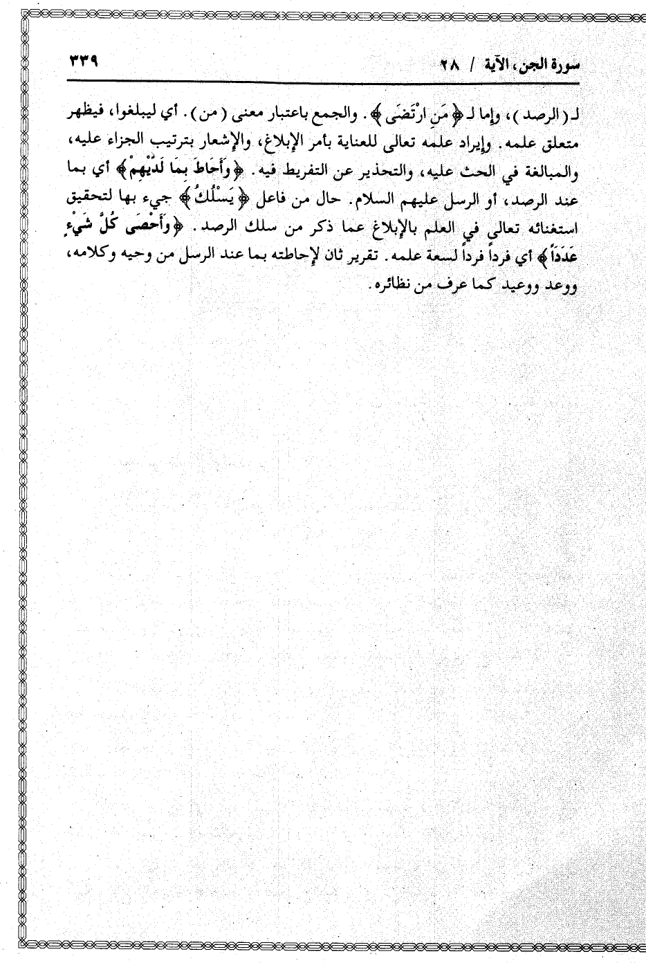 ل (الرصد) ، وإما ل مَنِ ارْتَضى. والجمع باعتبار معنى (من) . أي ليبلغوا، فيظهر متعلق علمه. وإيراد علمه تعالى للعناية بأمر الإبلاغ، والإشعار بترتيب الجزاء عليه، والمبالغة في الحث عليه، والتحذير عن التفريط فيه. وَأَحاطَ بِما لَدَيْهِمْ أي بما عند الرصد، أو الرسل عليهم السلام. حال من فاعل يَسْلُكُ جيء بها لتحقيق استغنائه تعالى في العلم بالإبلاغ عما ذكر من سلك الرصد. وَأَحْصى كُلَّ شَيْءٍ عَدَداً أي فردا فردا لسعة علمه. تقرير ثان لإحاطته بما عند الرسل من وحيه وكلامه، ووعد ووعيد كما عرف من نظائره.