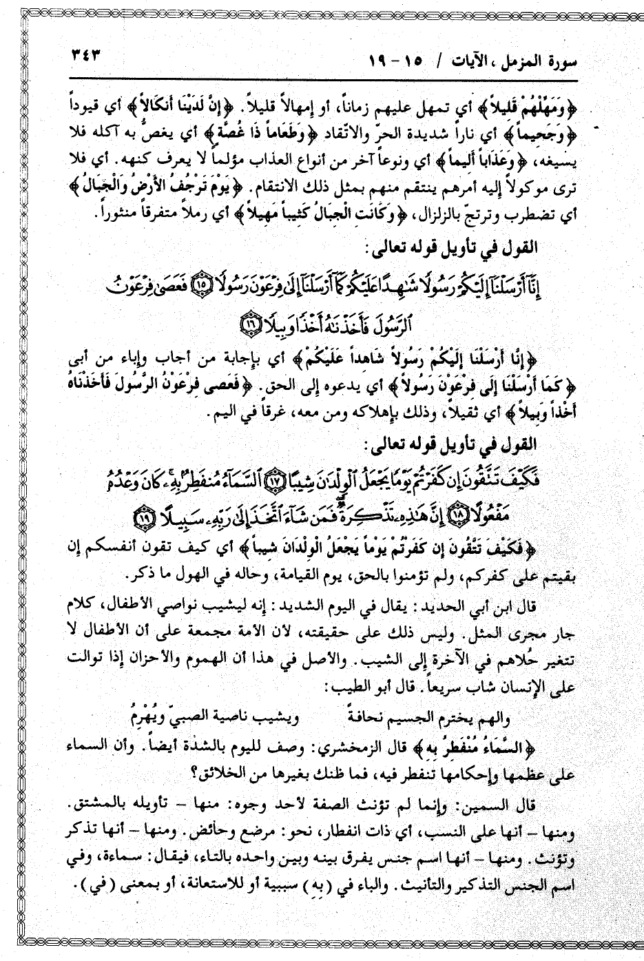 فَكَيْفَ تَتَّقُونَ إِنْ كَفَرْتُمْ يَوْماً يَجْعَلُ الْوِلْدانَ شِيباً (17) السَّماءُ مُنْفَطِرٌ بِهِ كانَ وَعْدُهُ مَفْعُولاً (18) إِنَّ هذِهِ تَذْكِرَةٌ فَمَنْ شاءَ اتَّخَذَ إِلى رَبِّهِ سَبِيلاً (19)