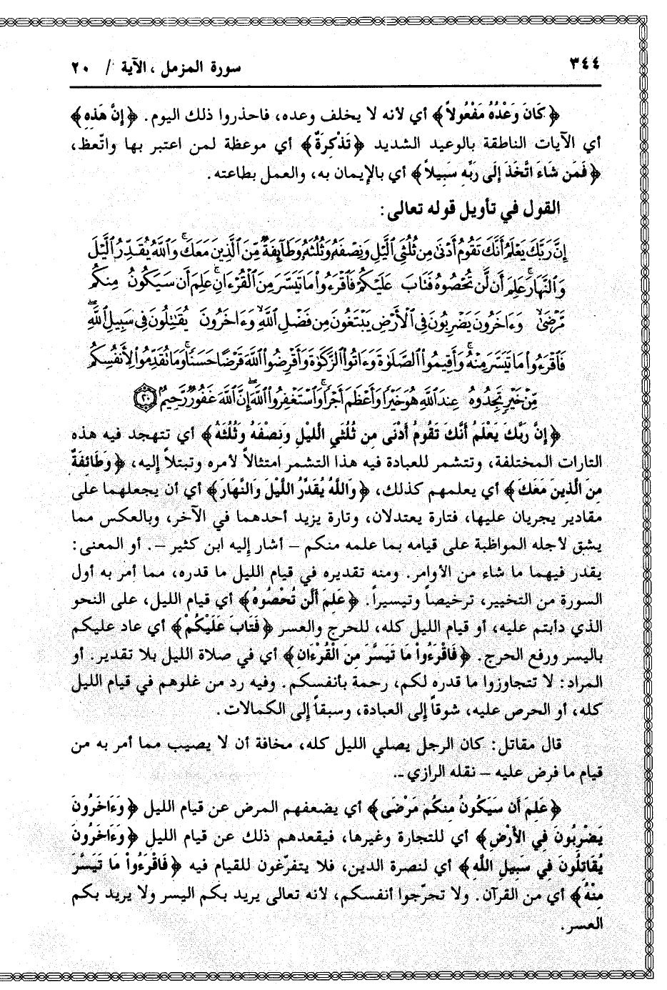 إِنَّ رَبَّكَ يَعْلَمُ أَنَّكَ تَقُومُ أَدْنى مِنْ ثُلُثَيِ اللَّيْلِ وَنِصْفَهُ وَثُلُثَهُ وَطائِفَةٌ مِنَ الَّذِينَ مَعَكَ وَاللَّهُ يُقَدِّرُ اللَّيْلَ وَالنَّهارَ عَلِمَ أَنْ لَنْ تُحْصُوهُ فَتابَ عَلَيْكُمْ فَاقْرَؤُا ما تَيَسَّرَ مِنَ الْقُرْآنِ عَلِمَ أَنْ سَيَكُونُ مِنْكُمْ مَرْضى وَآخَرُونَ يَضْرِبُونَ فِي الْأَرْضِ يَبْتَغُونَ مِنْ فَضْلِ اللَّهِ وَآخَرُونَ يُقاتِلُونَ فِي سَبِيلِ اللَّهِ فَاقْرَؤُا ما تَيَسَّرَ مِنْهُ وَأَقِيمُوا الصَّلاةَ وَآتُوا الزَّكاةَ وَأَقْرِضُوا اللَّهَ قَرْضاً حَسَناً وَما تُقَدِّمُوا لِأَنْفُسِكُمْ مِنْ خَيْرٍ تَجِدُوهُ عِنْدَ اللَّهِ هُوَ خَيْراً وَأَعْظَمَ أَجْراً وَاسْتَغْفِرُوا اللَّهَ إِنَّ اللَّهَ غَفُورٌ رَحِيمٌ (20)