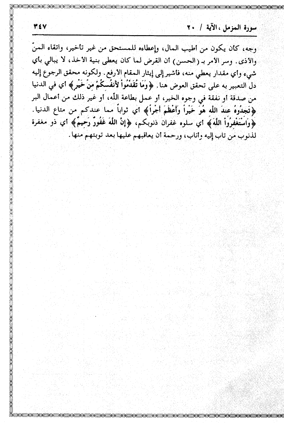 وجه، كأن يكون من أطيب المال، وإعطاءه للمستحق من غير تأخير، واتقاء المنّ والأذى. وسر الأمر ب (الحسن) أن القرض لما كان يعطى بنية الأخذ، لا يبالي بأي شيء وأي مقدار يعطي منه، فأشير إلى إيثار المقام الأرفع. ولكونه محقق الرجوع إليه دل التعبير به على تحقق العوض هنا. وَما تُقَدِّمُوا لِأَنْفُسِكُمْ مِنْ خَيْرٍ أي في الدنيا من صدقة أو نفقة في وجوه الخير، أو عمل بطاعة الله، أو غير ذلك من أعمال البر تَجِدُوهُ عِنْدَ اللَّهِ هُوَ خَيْراً وَأَعْظَمَ أَجْراً أي ثوابا مما عندكم من متاع الدنيا.