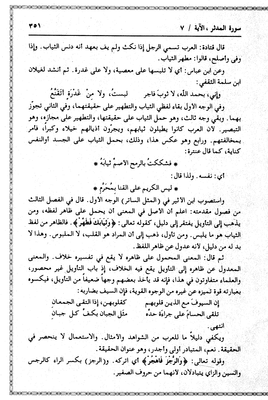 وفي الوجه الأول بقاء لفظي الثياب والتطهير على حقيقتهما، وفي الثاني تجوّز بهما. وبقي وجه ثالث، وهو حمل الثياب على حقيقتها، والتطهير على مجازه، وهو التبصير. لأن العرب كانوا يطيلون ثيابهم، ويجرّون أذيالهم خيلاء وكبرا، فأمر بمخالفتهم. ورابع وهو عكس هذا، وذلك، بحمل الثياب على الجسد أو النفس كناية، كما قال عنترة: