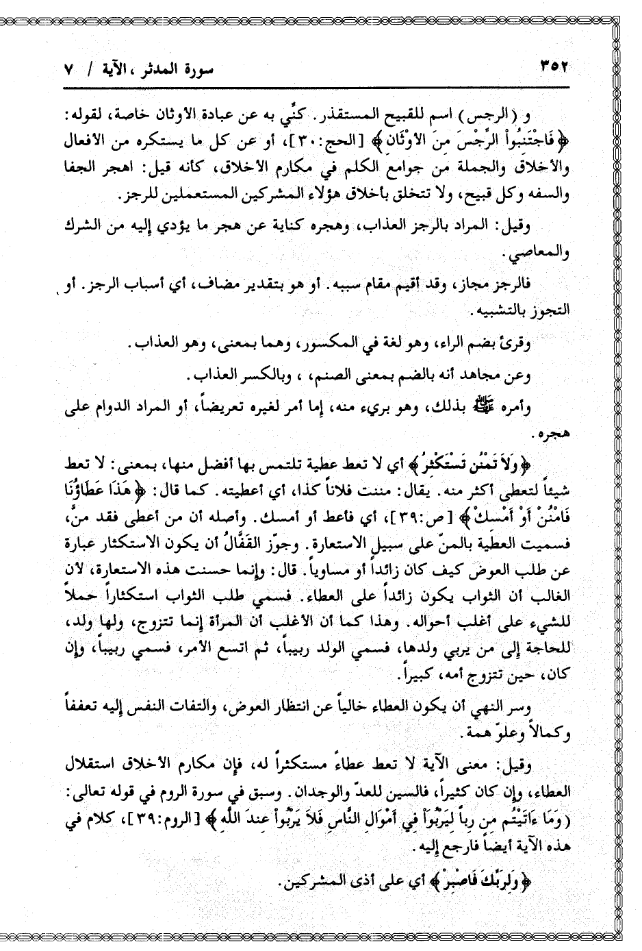 وَلا تَمْنُنْ تَسْتَكْثِرُ أي لا تعط عطية تلتمس بها أفضل منها، بمعنى: لا تعط شيئا لتعطى أكثر منه. يقال: مننت فلانا كذا، أي أعطيته. كما قال: هذا عَطاؤُنا فَامْنُنْ أَوْ أَمْسِكْ [ص: 39] ، أي فأعط أو أمسك. وأصله أن من أعطى فقد منّ، فسميت العطية بالمنّ على سبيل الاستعارة. وجوّز القفّال أن يكون الاستكثار عبارة عن طلب العوض كيف كان زائدا أو مساويا. قال: وإنما حسنت هذه الاستعارة، لأن الغالب أن الثواب يكون زائدا على العطاء. فسمي طلب الثواب استكثارا حملا للشيء على أغلب أحواله. وهذا كما أن الأغلب أن المرأة إنما تتزوج، ولها ولد، للحاجة إلى من يربي ولدها، فسمي الولد ربيبا، ثم اتسع الأمر، فسمي ربيبا، وإن كان، حين تتزوج أمه، كبيرا.