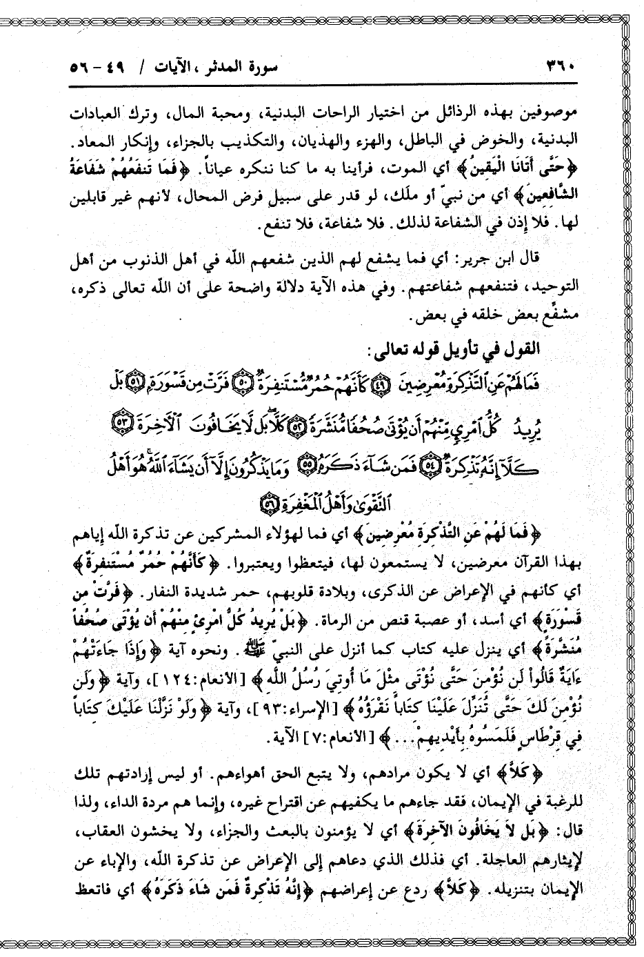 فَما لَهُمْ عَنِ التَّذْكِرَةِ مُعْرِضِينَ أي فما لهؤلاء المشركين عن تذكرة الله إياهم بهذا القرآن معرضين، لا يستمعون لها، فيتعظوا ويعتبروا. كَأَنَّهُمْ حُمُرٌ مُسْتَنْفِرَةٌ أي كأنهم في الإعراض عن الذكرى، وبلادة قلوبهم، حمر شديدة النفار. فَرَّتْ مِنْ قَسْوَرَةٍ أي أسد، أو عصبة قنص من الرماة. بَلْ يُرِيدُ كُلُّ امْرِئٍ مِنْهُمْ أَنْ يُؤْتى صُحُفاً مُنَشَّرَةً أي ينزل عليه كتاب كما أنزل على النبيّ صلى الله عليه وسلم. ونحوه آية وَإِذا جاءَتْهُمْ آيَةٌ قالُوا لَنْ نُؤْمِنَ حَتَّى نُؤْتى مِثْلَ ما أُوتِيَ رُسُلُ اللَّهِ [الأنعام: 124] ، وآية وَلَنْ نُؤْمِنَ لِرُقِيِّكَ حَتَّى تُنَزِّلَ عَلَيْنا كِتاباً نَقْرَؤُهُ [الإسراء: 93] ، وآية وَلَوْ نَزَّلْنا عَلَيْكَ كِتاباً فِي قِرْطاسٍ فَلَمَسُوهُ بِأَيْدِيهِمْ ... [الأنعام: 7] الآية.