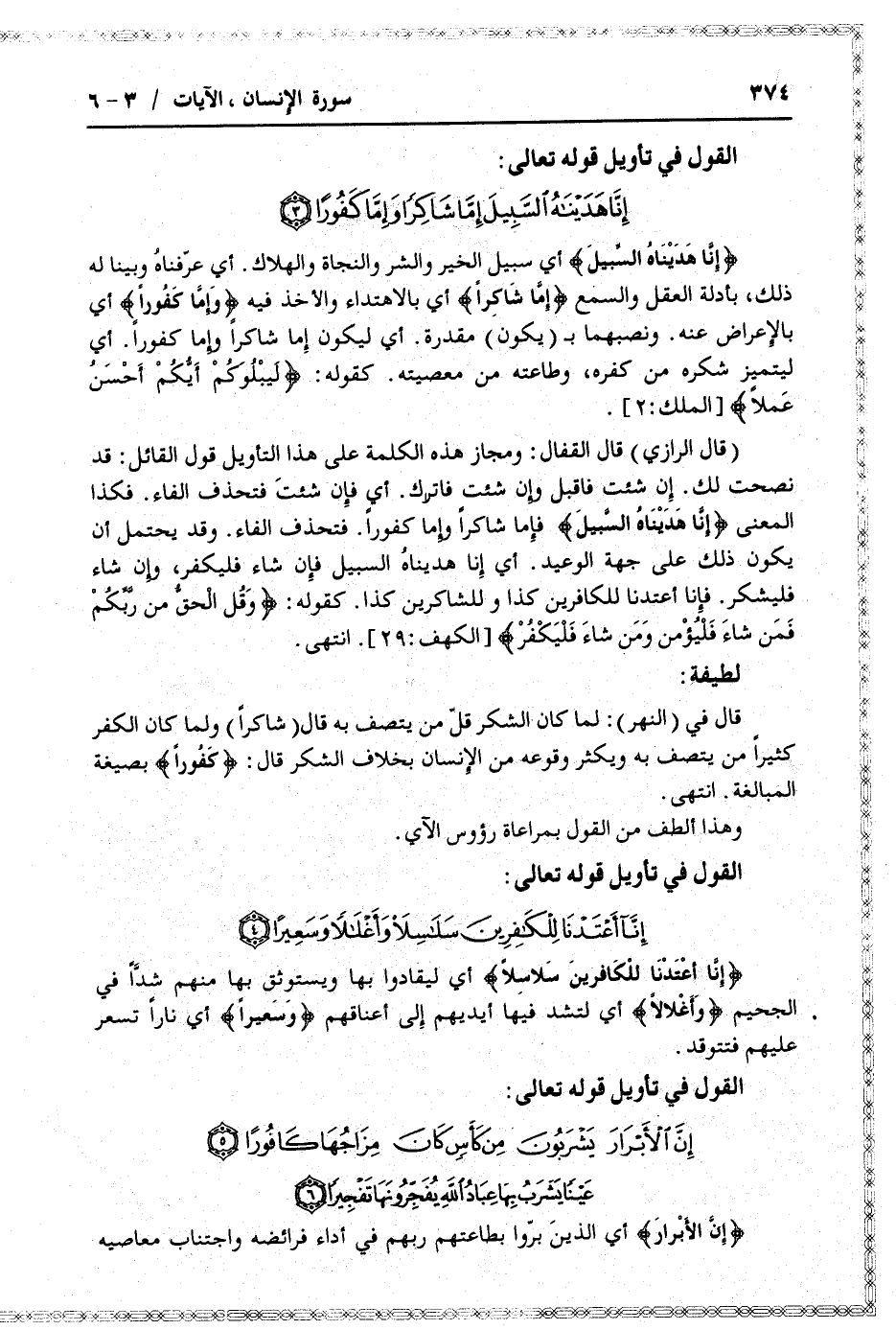 (قال الرازي) قال القفال: ومجاز هذه الكلمة على هذا التأويل قول القائل: قد نصحت لك. إن شئت فاقبل وإن شئت فاترك. أي فإن شئت فتحذف الفاء. فكذا المعنى إِنَّا هَدَيْناهُ السَّبِيلَ فإما شاكرا وإما كفورا. فتحذف الفاء. وقد يحتمل أن يكون ذلك على جهة الوعيد. أي إنا هديناه السبيل فإن شاء فليكفر، وإن شاء فليشكر. فإنا أعتدنا للكافرين كذا وللشاكرين كذا. كقوله: وَقُلِ الْحَقُّ مِنْ رَبِّكُمْ فَمَنْ شاءَ فَلْيُؤْمِنْ وَمَنْ شاءَ فَلْيَكْفُرْ [الكهف: 29] . انتهى.
