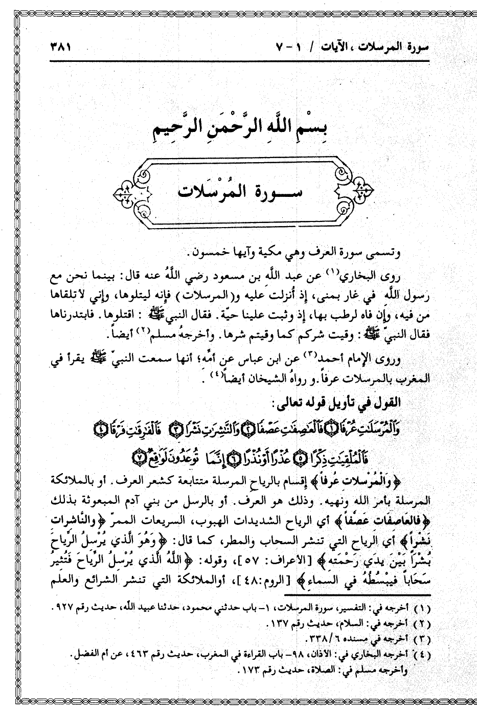 وَالْمُرْسَلاتِ عُرْفاً (1) فَالْعاصِفاتِ عَصْفاً (2) وَالنَّاشِراتِ نَشْراً (3) فَالْفارِقاتِ فَرْقاً (4)