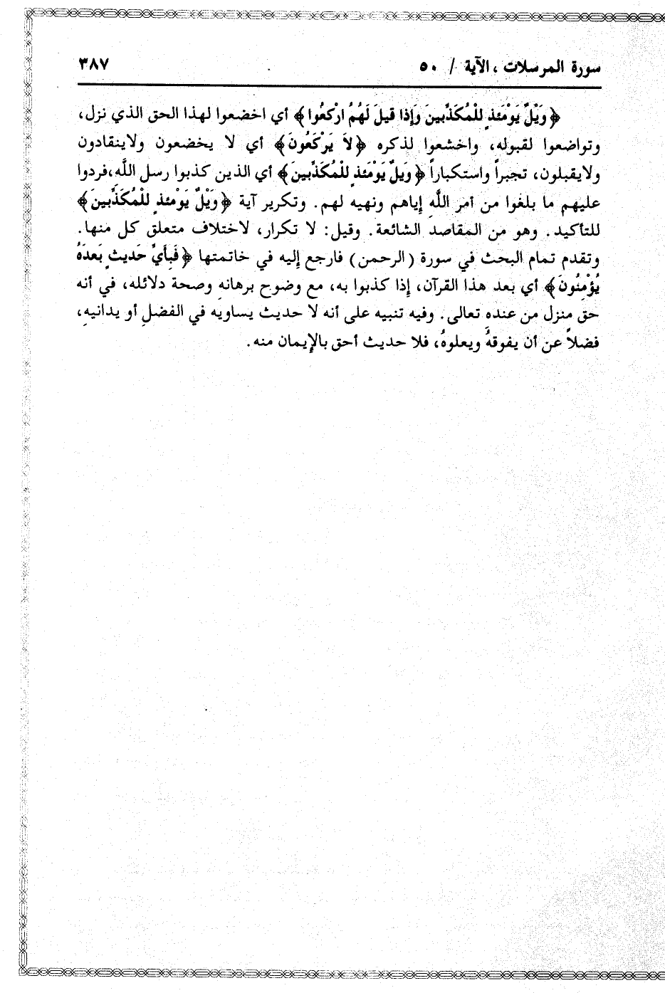 وَيْلٌ يَوْمَئِذٍ لِلْمُكَذِّبِينَ وَإِذا قِيلَ لَهُمُ ارْكَعُوا أي اخضعوا لهذا الحق الذي نزل، وتواضعوا لقبوله، واخشعوا لذكره لا يَرْكَعُونَ أي لا يخضعون ولا ينقادون ولا يقبلون، تجبرا واستكبارا وَيْلٌ يَوْمَئِذٍ لِلْمُكَذِّبِينَ أي الذين كذبوا رسل الله، فردوا عليهم ما بلغوا من أمر الله إياهم ونهيه لهم. وتكرير آية وَيْلٌ يَوْمَئِذٍ لِلْمُكَذِّبِينَ للتأكيد. وهو من المقاصد الشائعة. وقيل: لا تكرار، لاختلاف متعلق كل منها.