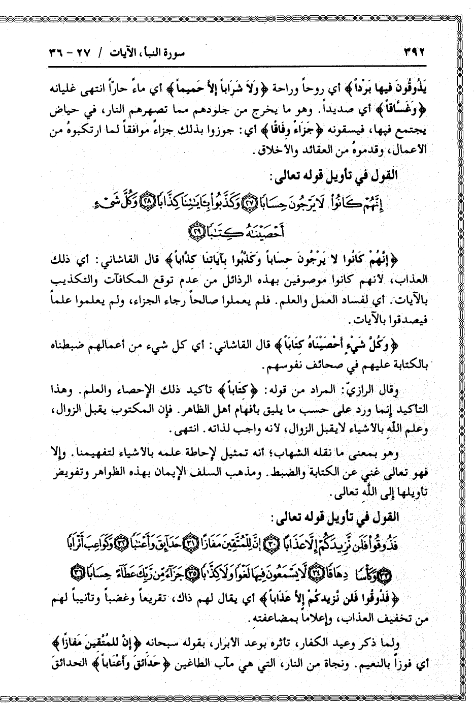 إِنَّهُمْ كانُوا لا يَرْجُونَ حِساباً وَكَذَّبُوا بِآياتِنا كِذَّاباً قال القاشاني: أي ذلك العذاب، لأنهم كانوا موصوفين بهذه الرذائل من عدم توقع المكافاة والتكذيب بالآيات. أي لفساد العمل والعلم. فلم يعملوا صالحا رجاء الجزاء، ولم يعلموا علما فيصدقوا بالآيات.