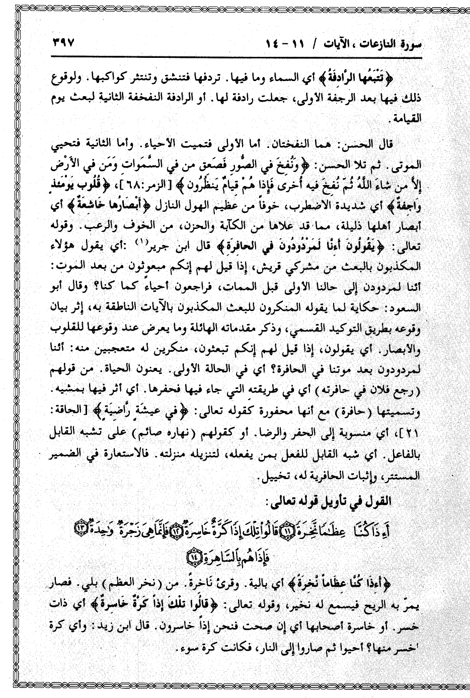 أَإِذا كُنَّا عِظاماً نَخِرَةً (11) قالُوا تِلْكَ إِذاً كَرَّةٌ خاسِرَةٌ (12) فَإِنَّما هِيَ زَجْرَةٌ واحِدَةٌ (13) فَإِذا هُمْ بِالسَّاهِرَةِ (14)