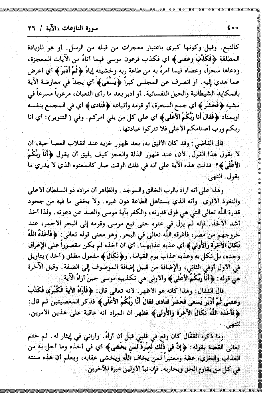 وهذا على أنه أراد بالرب الخالق والموجد. والظاهر أن مراده ذو السلطان الأعلى والنفوذ الأقوى. وأنه الذي يستأهل الطاعة دون غيره. ولا يخفى ما فيه من جحود قدرة الله تعالى التي هي فوق قدرته، والكفر بآية موسى والصد عن دعوته. ولذا أخذ أشد الأخذ. فإنه لم يزل في عتوه حتى تبع موسى وقومه إلى البحر الأحمر، عند خروجهم من مصر، فأغرقه الله تعالى في البحر. وهو معنى قوله تعالى: فَأَخَذَهُ اللَّهُ نَكالَ الْآخِرَةِ وَالْأُولى أي عذبه عذابهما. أي أن أخذه لم يكن مقصورا على الإغراق وحده، بل نكل به وعذبه عذاب يوم القيامة. ونَكالَ مفعول مطلق (أخذ) بتأويل في الأول أو في الثاني، والإضافة من قبيل إضافة الموصوف إلى الصفة. وقيل الآخرة هي قوله: أَنَا رَبُّكُمُ الْأَعْلى والأولى هي تكذيبه موسى حين أراه الآية.