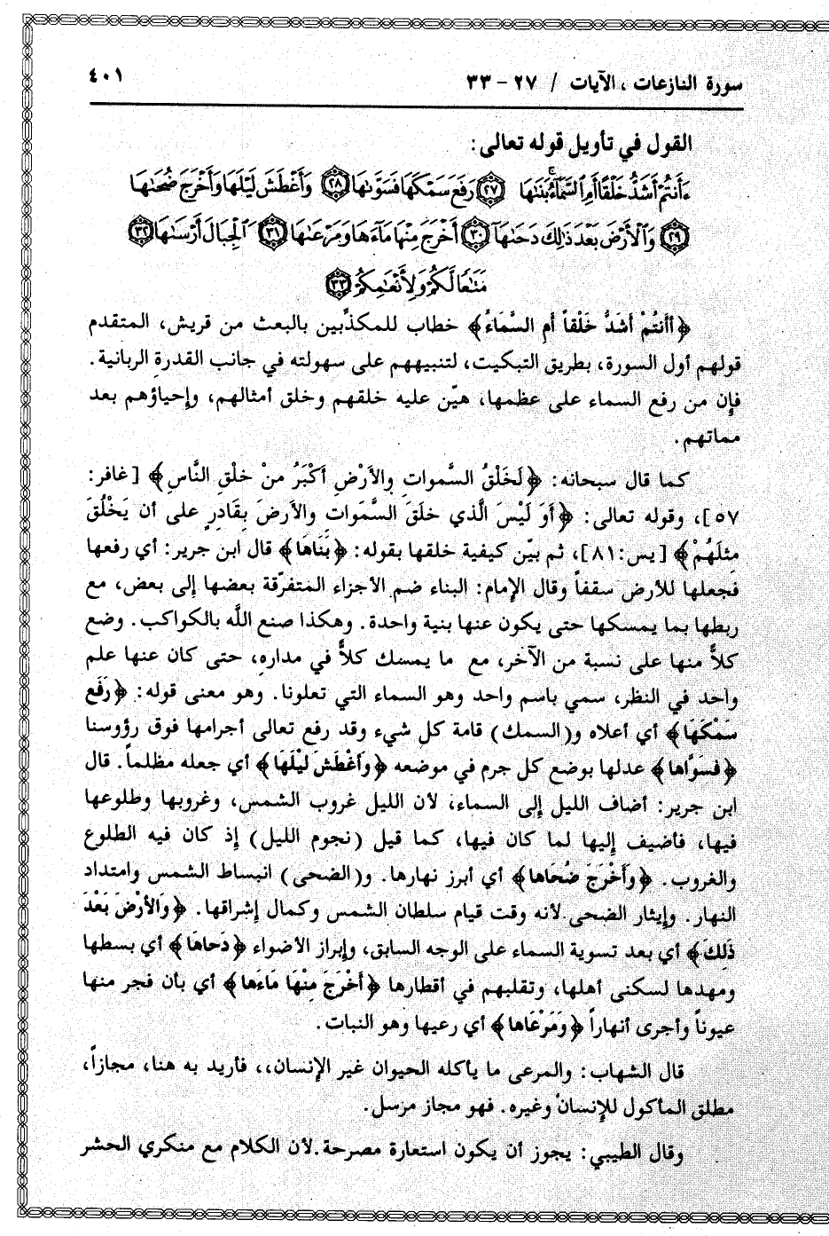 أَأَنْتُمْ أَشَدُّ خَلْقاً أَمِ السَّماءُ بَناها (27) رَفَعَ سَمْكَها فَسَوَّاها (28) وَأَغْطَشَ لَيْلَها وَأَخْرَجَ ضُحاها (29) وَالْأَرْضَ بَعْدَ ذلِكَ دَحاها (30) أَخْرَجَ مِنْها ماءَها وَمَرْعاها (31)