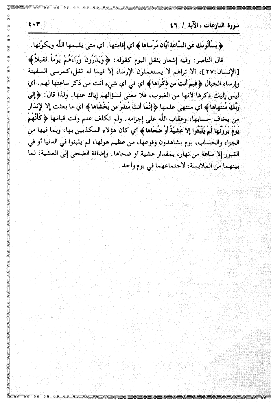 أي في أي شيء أنت من ذكر ساعتها لهم. أي ليس إليك ذكرها لأنها من الغيوب، فلا معنى لسؤالهم إياك عنها. ولذا قال: إِلى رَبِّكَ مُنْتَهاها أي منتهى علمها إِنَّما أَنْتَ مُنْذِرُ مَنْ يَخْشاها أي ما بعثت إلا لإنذار من يخاف حسابها، وعقاب الله على إجرامه. ولم تكلف علم وقت قيامها كَأَنَّهُمْ يَوْمَ يَرَوْنَها لَمْ يَلْبَثُوا إِلَّا عَشِيَّةً أَوْ ضُحاها أي كأن هؤلاء المكذبين بها، وبما فيها من الجزاء والحساب، يوم يشاهدون وقوعها، من عظيم هولها، لم يلبثوا في الدنيا أو في القبور إلا ساعة من نهار، بمقدار عشية أو ضحاها. وإضافة الضحى إلى العشية، لما بينهما من الملابسة، لاجتماعهما في يوم واحد.
