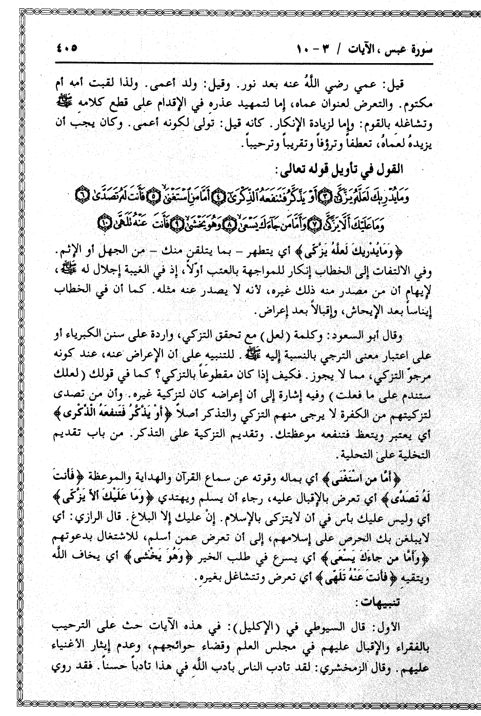 وقال أبو السعود: وكلمة (لعل) مع تحقق التزكي، واردة على سنن الكبرياء أو على اعتبار معنى الترجي بالنسبة إليه صلى الله عليه وسلم. للتنبيه على أن الإعراض عنه، عند كونه مرجوّ التزكي، مما لا يجوز. فكيف إذا كان مقطوعا بالتزكي؟ كما في قولك (لعلك ستندم على ما فعلت) وفيه إشارة إلى أن إعراضه كان لتزكية غيره. وأن من تصدى لتزكيتهم من الكفرة لا يرجى منهم التزكي والتذكر أصلا أَوْ يَذَّكَّرُ فَتَنْفَعَهُ الذِّكْرى أي يعتبر ويتعظ فتنفعه موعظتك. وتقديم التزكية على التذكر. من باب تقديم التخلية على التحلية.