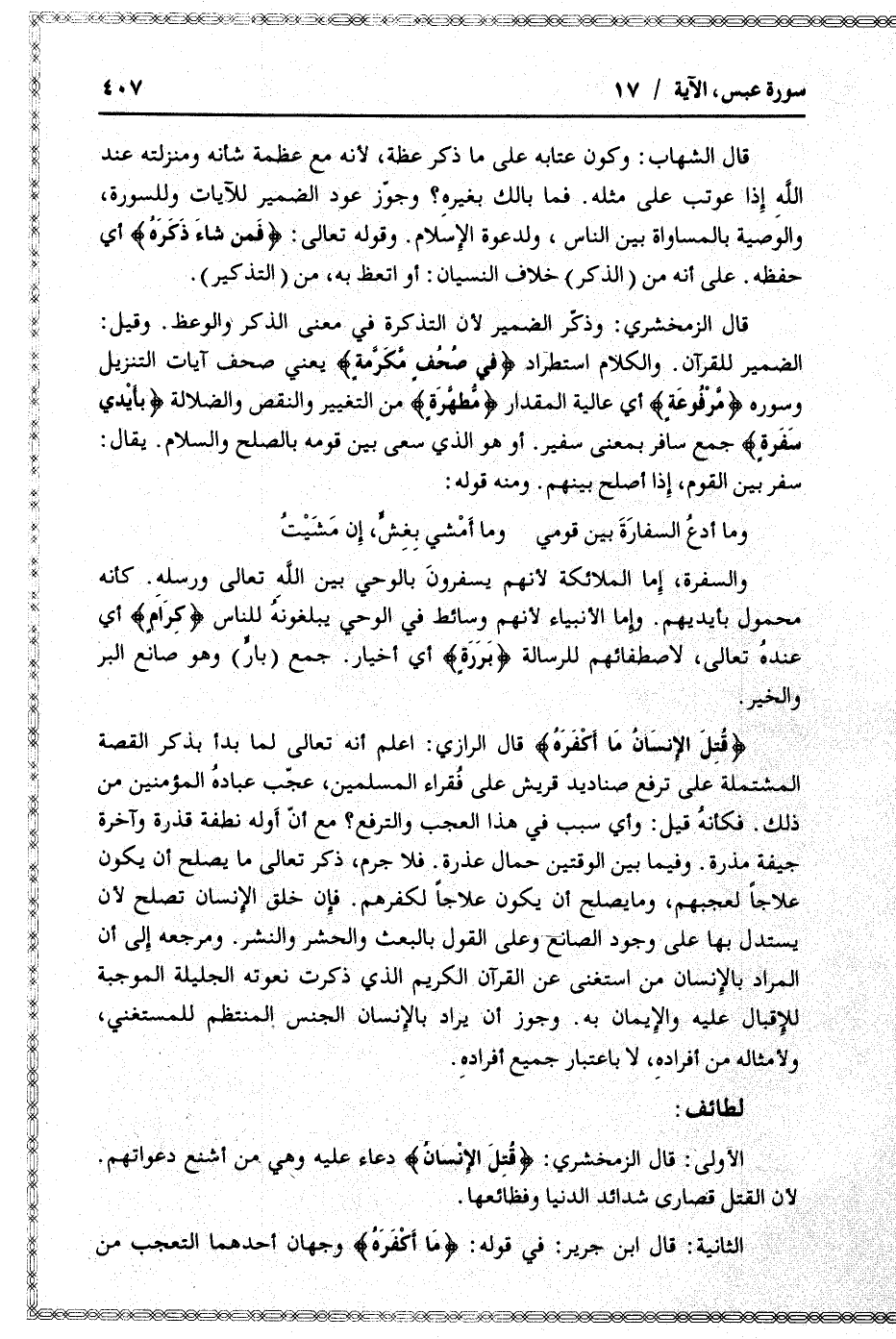 قُتِلَ الْإِنْسانُ ما أَكْفَرَهُ قال الرازي: اعلم أنه تعالى لما بدأ بذكر القصة المشتملة على ترفع صناديد قريش على فقراء المسلمين، عجّب عباده المؤمنين من ذلك. فكأنه قيل: وأي سبب في هذا العجب والترفع؟ مع أنّ أوله نطفة قذرة وآخرة جيفة مذرة. وفيما بين الوقتين حمال عذرة. فلا جرم، ذكر تعالى ما يصلح أن يكون علاجا لعجبهم، وما يصلح أن يكون علاجا لكفرهم. فإن خلق الإنسان تصلح لأن يستدل بها على وجود الصانع وعلى القول بالبعث والحشر والنشر. ومرجعه إلى أن المراد بالإنسان من استغنى عن القرآن الكريم الذي ذكرت نعوته الجليلة الموجبة للإقبال عليه والإيمان به. وجوز أن يراد بالإنسان الجنس المنتظم للمستغني، ولأمثاله من أفراده، لا باعتبار جميع أفراده.