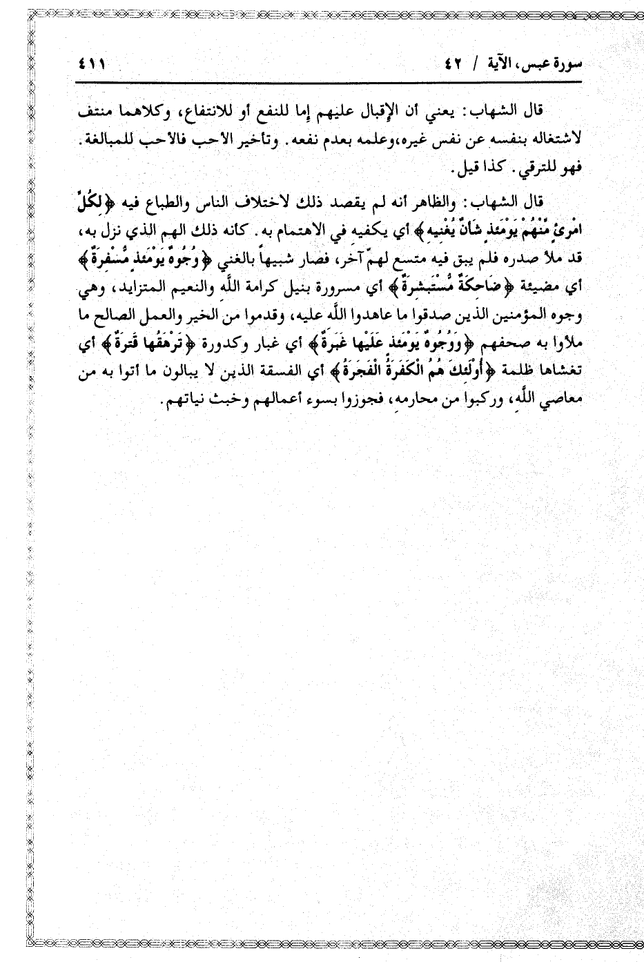 قال الشهاب: والظاهر أنه لم يقصد ذلك لاختلاف الناس والطباع فيه لِكُلِّ امْرِئٍ مِنْهُمْ يَوْمَئِذٍ شَأْنٌ يُغْنِيهِ أي يكفيه في الاهتمام به. كأنه ذلك الهم الذي نزل به، قد ملأ صدره فلم يبق فيه متسع لهمّ آخر، فصار شبيها بالغني وُجُوهٌ يَوْمَئِذٍ مُسْفِرَةٌ أي مضيئة ضاحِكَةٌ مُسْتَبْشِرَةٌ أي مسرورة بنيل كرامة الله والنعيم المتزايد، وهي وجوه المؤمنين الذين صدقوا ما عاهدوا الله عليه، وقدموا من الخير والعمل الصالح ما ملأوا به صحفهم وَوُجُوهٌ يَوْمَئِذٍ عَلَيْها غَبَرَةٌ أي غبار وكدورة تَرْهَقُها قَتَرَةٌ أي تغشاها ظلمة أُولئِكَ هُمُ الْكَفَرَةُ الْفَجَرَةُ أي الفسقة الذين لا يبالون ما أتوا به من معاصي الله، وركبوا من محارمه، فجوزوا بسوء أعمالهم وخبث نياتهم.