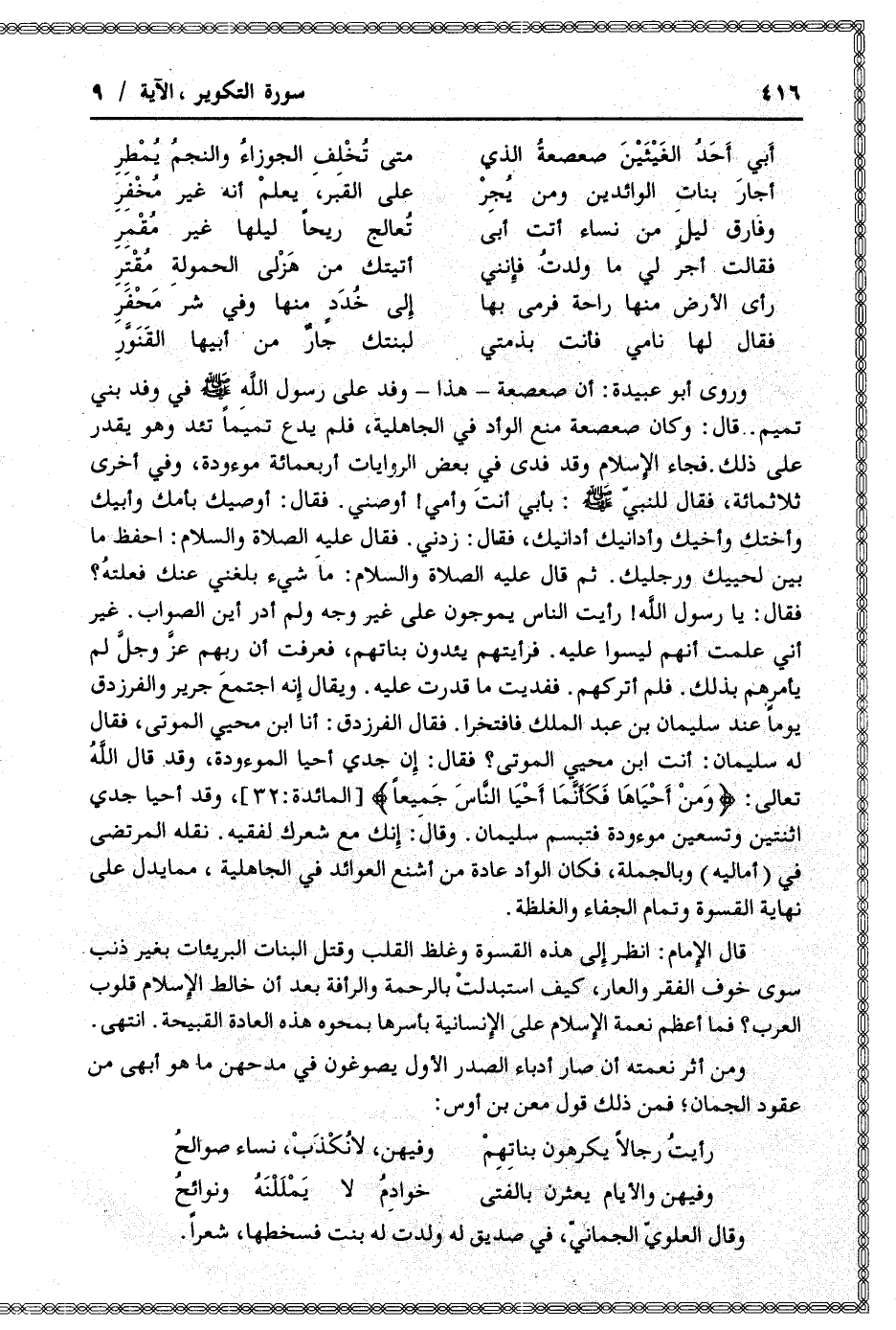 . ويقال إنه اجتمع جرير والفرزدق يوما عند سليمان بن عبد الملك فافتخرا. فقال الفرزدق: أنا ابن محيي الموتى، فقال له سليمان: أنت ابن محيي الموتى؟ فقال: إن جدي أحيا الموءودة، وقد قال الله تعالى: وَمَنْ أَحْياها فَكَأَنَّما أَحْيَا النَّاسَ جَمِيعاً [المائدة: 32] ، وقد أحيا جدي اثنتين وتسعين موءودة فتبسم سليمان. وقال: إنك مع شعرك لفقيه. نقله المرتضى في (أماليه) وبالجملة، فكان الوأد عادة من أشنع العوائد في الجاهلية، مما يدل على نهاية القسوة وتمام الجفاء والغلظة.