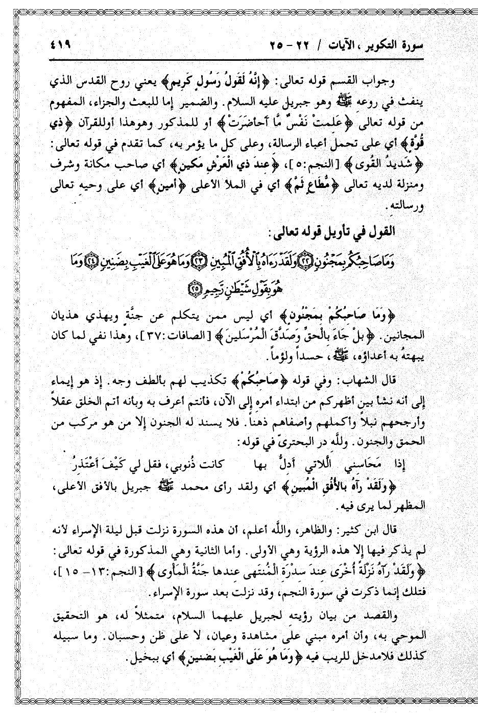 وَما صاحِبُكُمْ بِمَجْنُونٍ (22) وَلَقَدْ رَآهُ بِالْأُفُقِ الْمُبِينِ (23) وَما هُوَ عَلَى الْغَيْبِ بِضَنِينٍ (24) وَما هُوَ بِقَوْلِ شَيْطانٍ رَجِيمٍ (25)