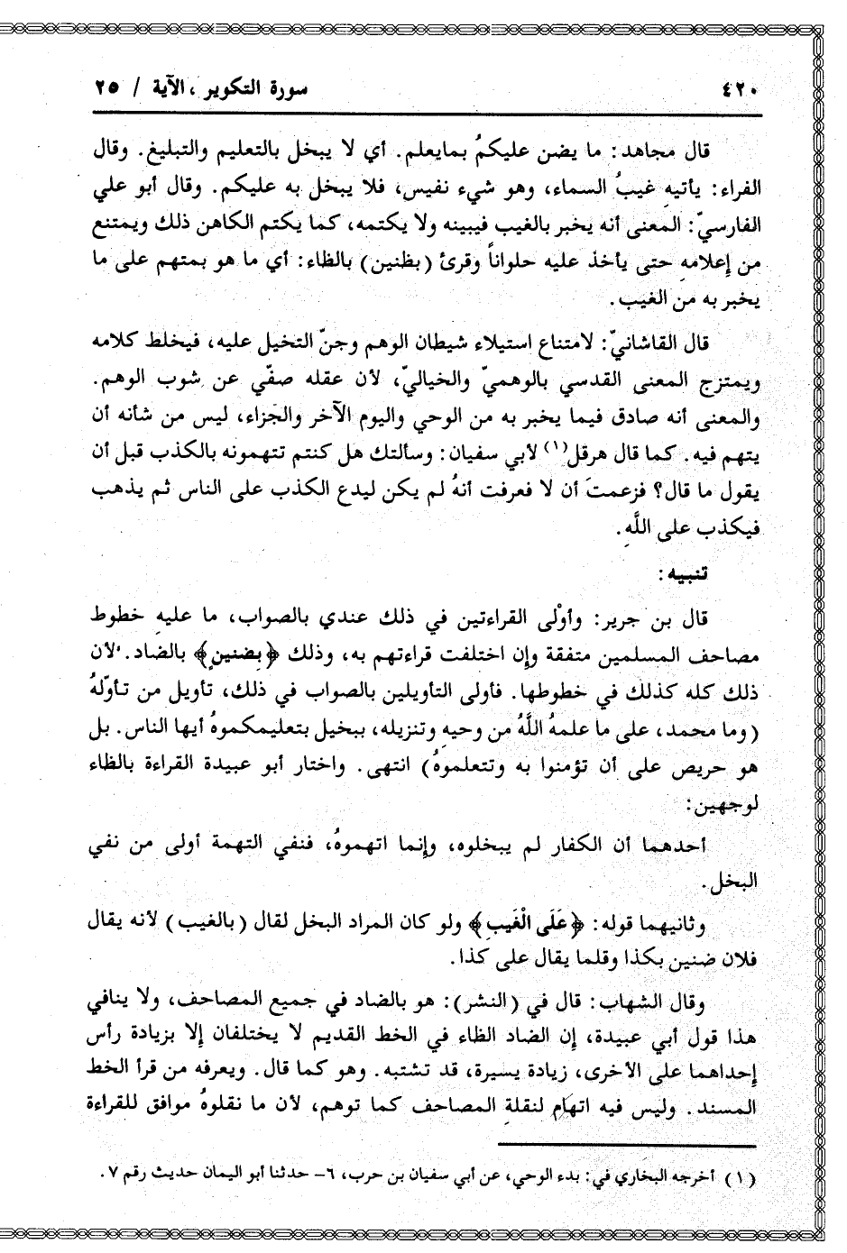 قال بن جرير: وأولى القراءتين في ذلك عندي بالصواب، ما عليه خطوط مصاحف المسلمين متفقة وإن اختلفت قراءتهم به، وذلك بِضَنِينٍ بالضاد. لأن ذلك كله كذلك في خطوطها. فأولى التأويلين بالصواب في ذلك، تأويل من تأوّله (وما محمد، على ما علمه الله من وحيه وتنزيله، ببخيل بتعليمكموه أيها الناس. بل هو حريص على أن تؤمنوا به وتتعلموه) انتهى. واختار أبو عبيدة القراءة بالظاء لوجهين: