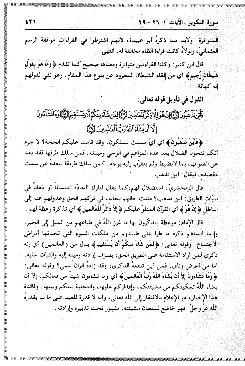 فَأَيْنَ تَذْهَبُونَ (26) إِنْ هُوَ إِلاَّ ذِكْرٌ لِلْعالَمِينَ (27) لِمَنْ شاءَ مِنْكُمْ أَنْ يَسْتَقِيمَ (28) وَما تَشاؤُنَ إِلاَّ أَنْ يَشاءَ اللَّهُ رَبُّ الْعالَمِينَ (29)
