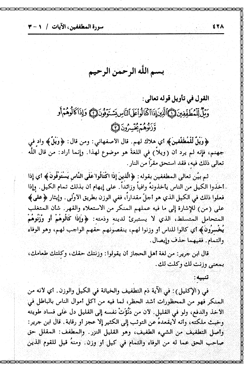 وَيْلٌ لِلْمُطَفِّفِينَ (1) الَّذِينَ إِذَا اكْتالُوا عَلَى النَّاسِ يَسْتَوْفُونَ (2) وَإِذا كالُوهُمْ أَوْ وَزَنُوهُمْ يُخْسِرُونَ (3)
