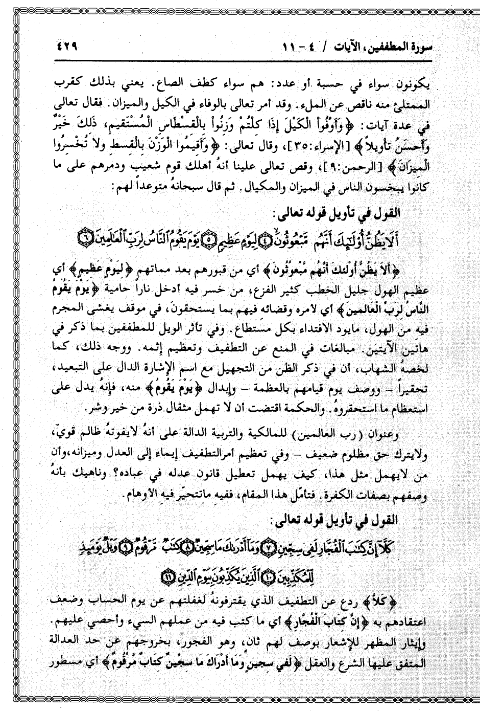 وعنوان (رب العالمين) للمالكية والتربية الدالة على أنه لا يفوته ظالم قويّ، ولا يترك حق مظلوم ضعيف- وفي تعظيم أمر التطفيف إيماء إلى العدل وميزانه، وأن من لا يهمل مثل هذا، كيف يهمل تعطيل قانون عدله في عباده؟ وناهيك بأنه وصفهم بصفات الكفرة. فتأمّل هذا المقام، ففيه ما تتحيّر فيه الأوهام.