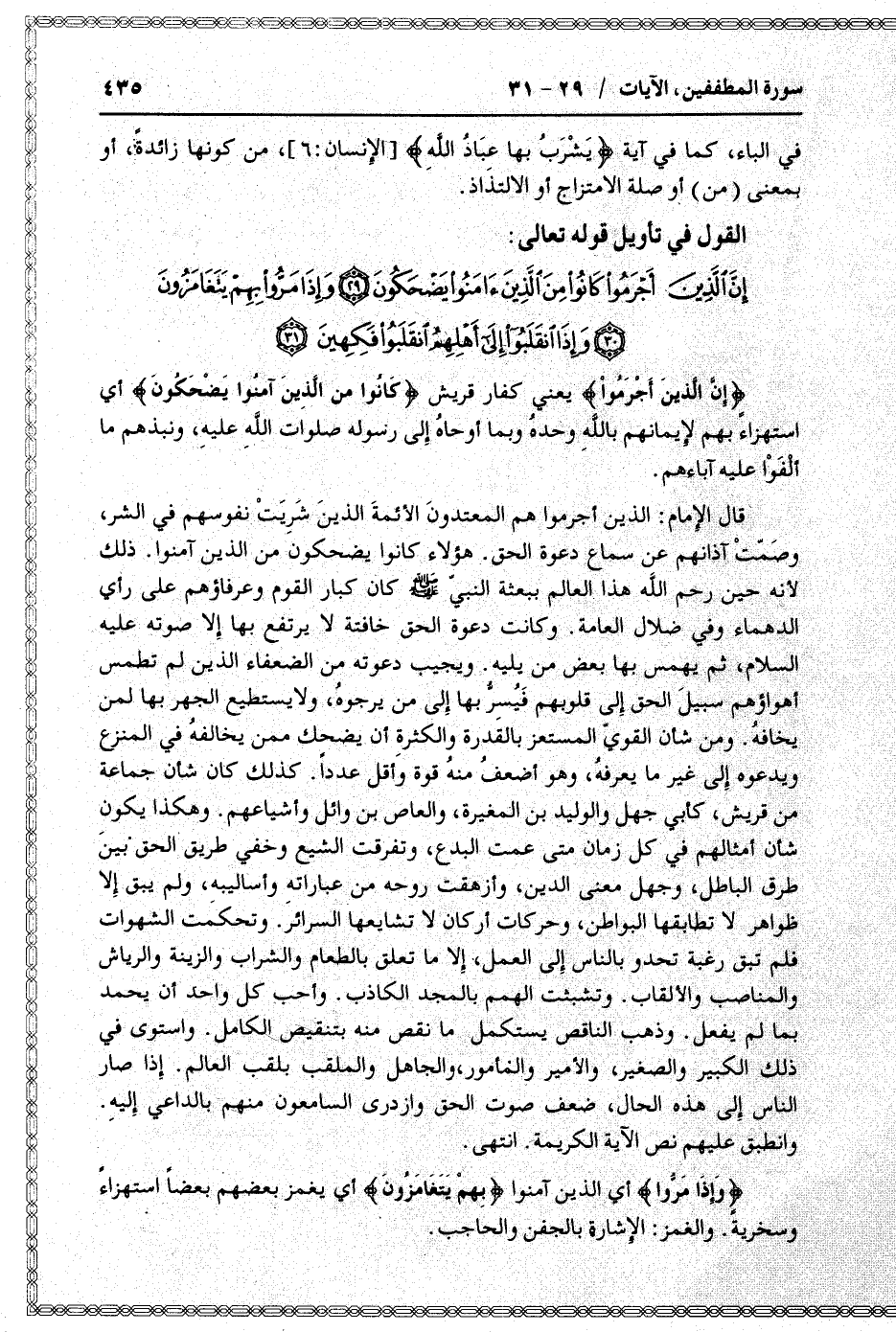 قال الإمام: الذين أجرموا هم المعتدون الأئمة الذين شريت نفوسهم في الشر، وصمّت آذانهم عن سماع دعوة الحق. هؤلاء كانوا يضحكون من الذين آمنوا. ذلك لأنه حين رحم الله هذا العالم ببعثة النبيّ صلى الله عليه وسلم كان كبار القوم وعرفاؤهم على رأي الدهماء وفي ضلال العامة. وكانت دعوة الحق خافتة لا يرتفع بها إلا صوته عليه السلام، ثم يهمس بها بعض من يليه. ويجيب دعوته من الضعفاء الذين لم تطمس أهواؤهم سبيل الحق إلى قلوبهم فيسرّ بها إلى من يرجوه، ولا يستطيع الجهر بها لمن يخافه. ومن شأن القويّ المستعز بالقدرة والكثرة أن يضحك ممن يخالفه في المنزع ويدعوه إلى غير ما يعرفه، وهو أضعف منه قوة وأقل عددا. كذلك كان شأن جماعة من قريش، كأبي جهل والوليد بن المغيرة، والعاص بن وائل وأشياعهم. وهكذا يكون شأن أمثالهم في كل زمان متى عمت البدع، وتفرقت الشيع وخفي طريق الحق بين طرق الباطل، وجهل معنى الدين، وأزهقت روحه من عباراته وأساليبه، ولم يبق إلا ظواهر لا تطابقها البواطن، وحركات أركان لا تشايعها السرائر. وتحكمت الشهوات فلم تبق رغبة تحدو بالناس إلى العمل، إلا ما تعلق بالطعام والشراب والزينة والرياش والمناصب والألقاب. وتشبثت الهمم بالمجد الكاذب. وأحب كل واحد أن يحمد بما لم يفعل. وذهب الناقص يستكمل ما نقص منه بتنقيص الكامل. واستوى في ذلك الكبير والصغير، والأمير والمأمور، والجاهل والملقب بلقب العالم. إذا صار الناس إلى هذه الحال، ضعف صوت الحق وازدرى السامعون منهم بالداعي إليه.