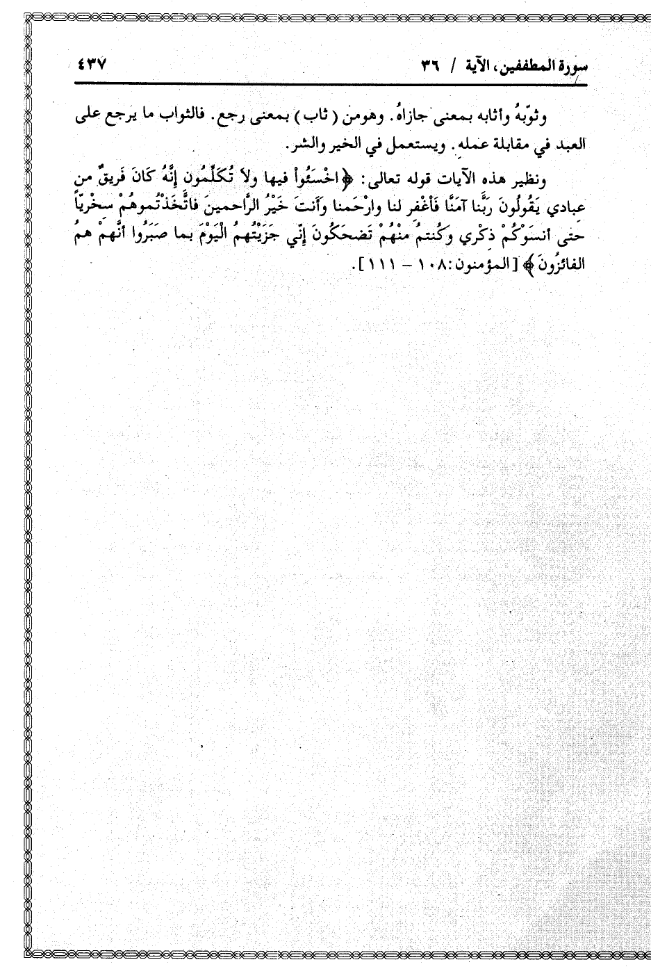 ونظير هذه الآيات قوله تعالى: اخْسَؤُا فِيها وَلا تُكَلِّمُونِ إِنَّهُ كانَ فَرِيقٌ مِنْ عِبادِي يَقُولُونَ رَبَّنا آمَنَّا فَاغْفِرْ لَنا وَارْحَمْنا وَأَنْتَ خَيْرُ الرَّاحِمِينَ فَاتَّخَذْتُمُوهُمْ سِخْرِيًّا حَتَّى أَنْسَوْكُمْ ذِكْرِي وَكُنْتُمْ مِنْهُمْ تَضْحَكُونَ إِنِّي جَزَيْتُهُمُ الْيَوْمَ بِما صَبَرُوا أَنَّهُمْ هُمُ الْفائِزُونَ [المؤمنون: 108- 111] .