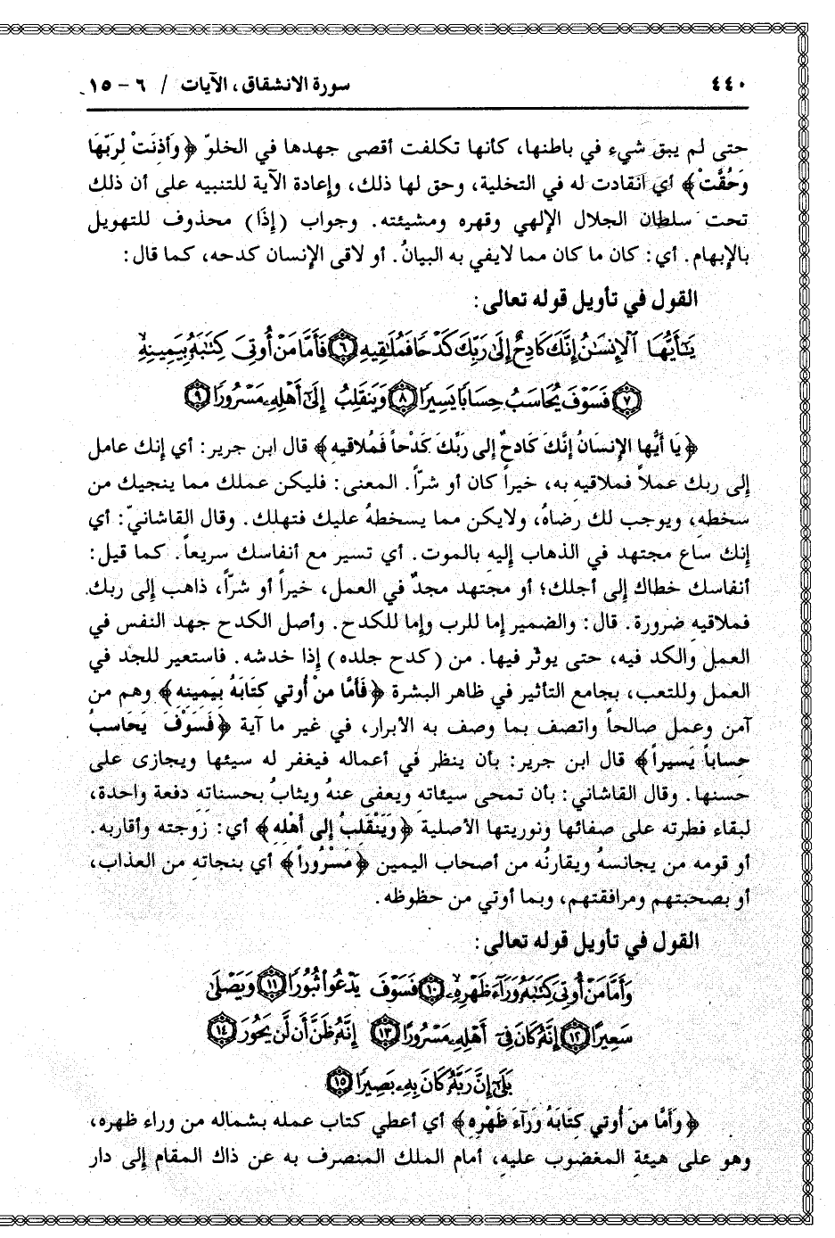 يا أَيُّهَا الْإِنْسانُ إِنَّكَ كادِحٌ إِلى رَبِّكَ كَدْحاً فَمُلاقِيهِ (6) فَأَمَّا مَنْ أُوتِيَ كِتابَهُ بِيَمِينِهِ (7) فَسَوْفَ يُحاسَبُ حِساباً يَسِيراً (8) وَيَنْقَلِبُ إِلى أَهْلِهِ مَسْرُوراً (9)