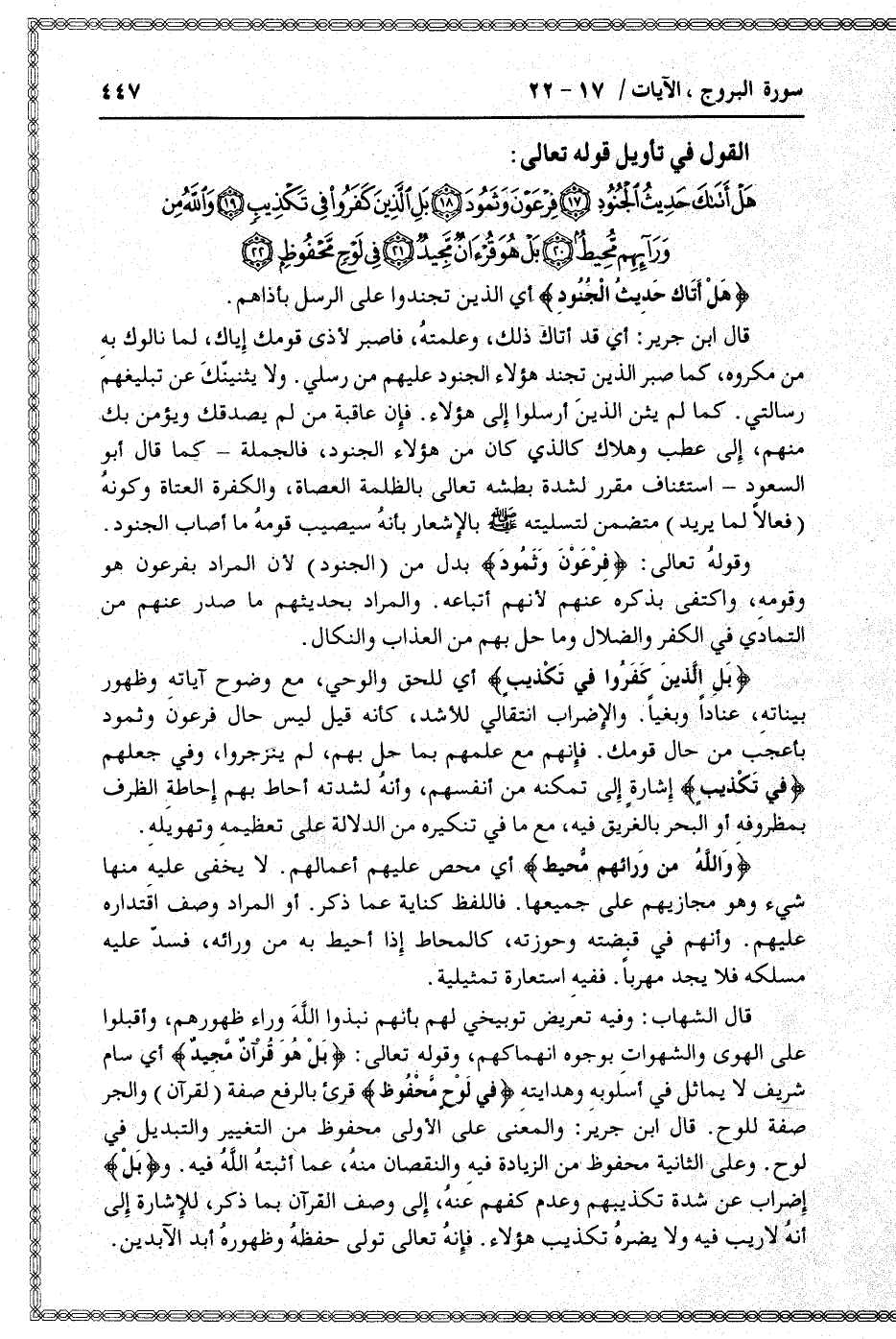 هَلْ أَتاكَ حَدِيثُ الْجُنُودِ (17) فِرْعَوْنَ وَثَمُودَ (18) بَلِ الَّذِينَ كَفَرُوا فِي تَكْذِيبٍ (19) وَاللَّهُ مِنْ وَرائِهِمْ مُحِيطٌ (20) بَلْ هُوَ قُرْآنٌ مَجِيدٌ (21)
