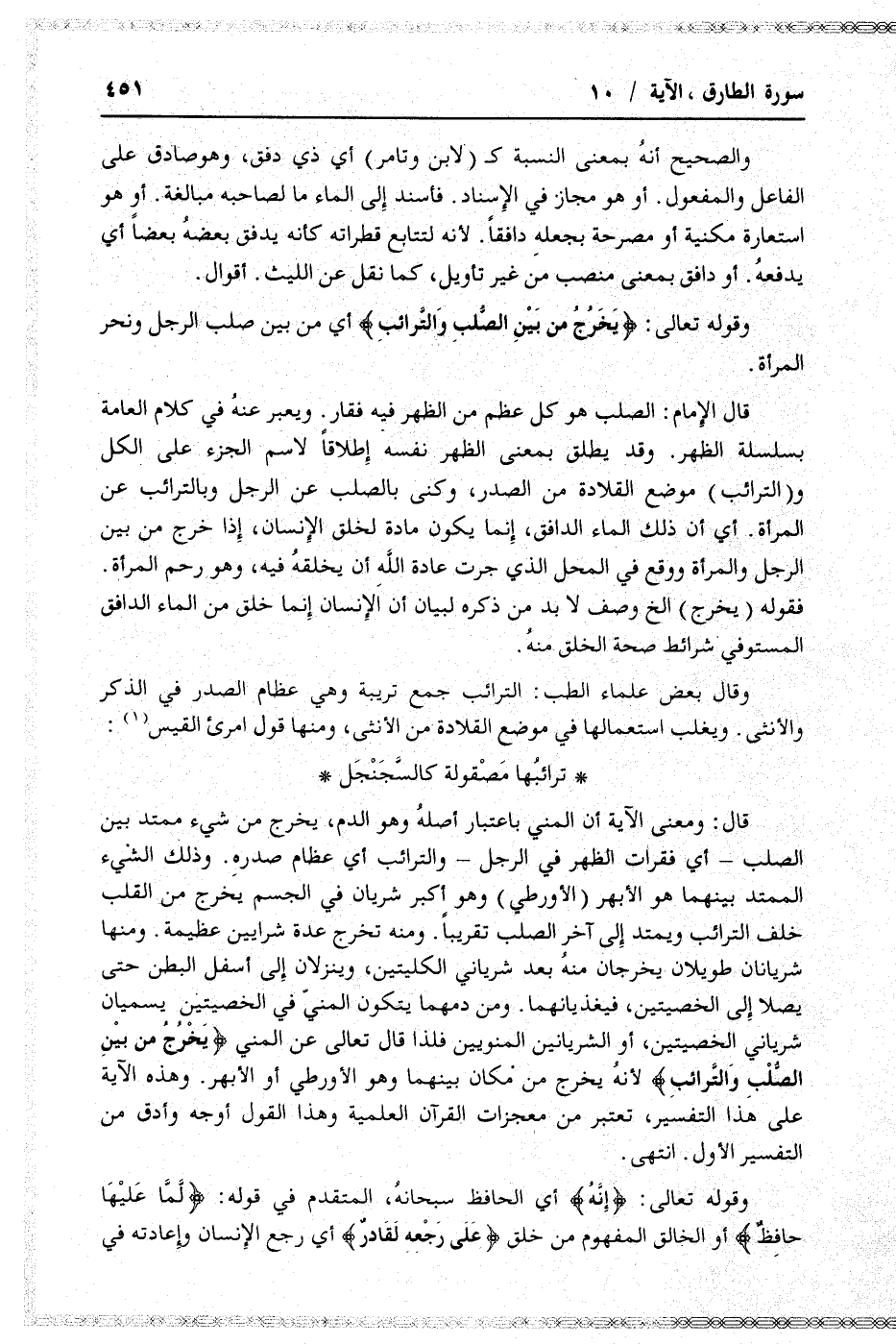 قال: ومعنى الآية أن المني باعتبار أصله وهو الدم، يخرج من شيء ممتد بين الصلب- أي فقرات الظهر في الرجل- والترائب أي عظام صدره. وذلك الشيء الممتد بينهما هو الأبهر (الأورطي) وهو أكبر شريان في الجسم يخرج من القلب خلف الترائب ويمتد إلى آخر الصلب تقريبا. ومنه تخرج عدة شرايين عظيمة. ومنها شريانان طويلان يخرجان منه بعد شرياني الكليتين، وينزلان إلى أسفل البطن حتى يصلا إلى الخصيتين، فيغذيانهما. ومن دمهما يتكون المنيّ في الخصيتين يسميان شرياني الخصيتين، أو الشريانين المنويين فلذا قال تعالى عن المني يَخْرُجُ مِنْ بَيْنِ الصُّلْبِ وَالتَّرائِبِ لأنه يخرج من مكان بينهما وهو الأورطي أو الأبهر. وهذه الآية على هذا التفسير، تعتبر من معجزات القرآن العلمية وهذا القول أوجه وأدق من التفسير الأول. انتهى.