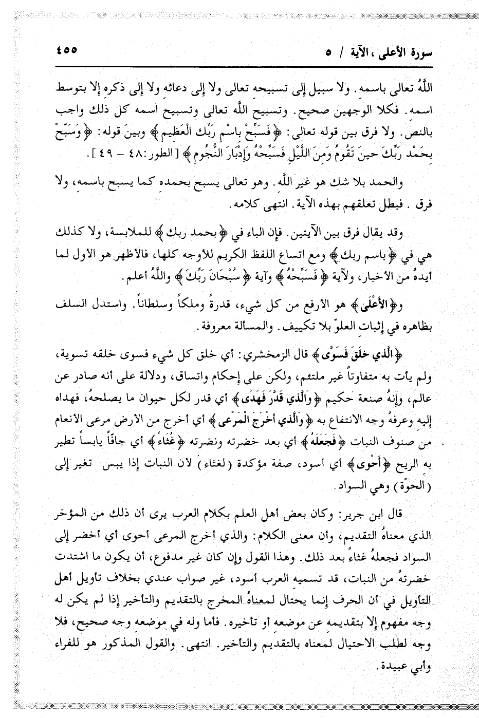 قال ابن جرير: وكان بعض أهل العلم بكلام العرب يرى أن ذلك من المؤخر الذي معناه التقديم، وأن معنى الكلام: والذي أخرج المرعى أحوى أي أخضر إلى السواد فجعله غثاء بعد ذلك. وهذا القول وإن كان غير مدفوع، أن يكون ما اشتدت خضرته من النبات، قد تسميه العرب أسود، غير صواب عندي بخلاف تأويل أهل التأويل في أن الحرف إنما يحتال لمعناه المخرج بالتقديم والتأخير إذا لم يكن له وجه مفهوم إلا بتقديمه عن موضعه أو تأخيره. فأما وله في موضعه وجه صحيح، فلا وجه لطلب الاحتيال لمعناه بالتقديم والتأخير. انتهى. والقول المذكور هو للفراء وأبي عبيدة.