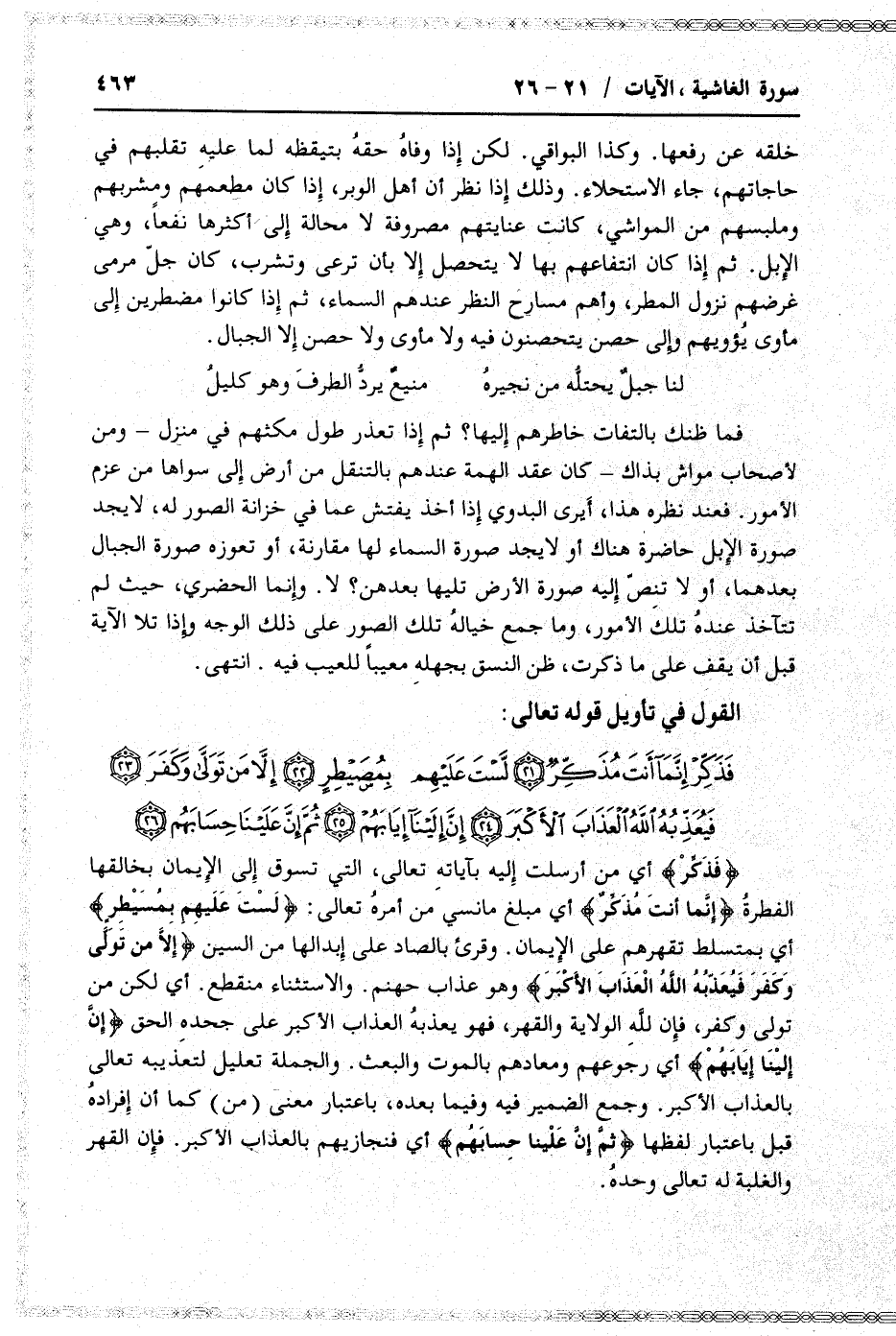 فَذَكِّرْ إِنَّما أَنْتَ مُذَكِّرٌ (21) لَسْتَ عَلَيْهِمْ بِمُصَيْطِرٍ (22) إِلاَّ مَنْ تَوَلَّى وَكَفَرَ (23) فَيُعَذِّبُهُ اللَّهُ الْعَذابَ الْأَكْبَرَ (24) إِنَّ إِلَيْنا إِيابَهُمْ (25)