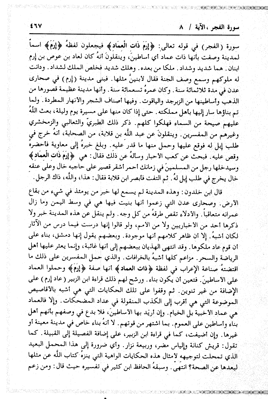 سورة (الفجر) في قوله تعالى: إِرَمَ ذاتِ الْعِمادِ فيجعلون لفظه إِرَمَ اسما لمدينة وصفت بأنها ذات عماد أي أساطين، وينقلون أنه كان لعاد بن عوص بن إرم ابنان. هما شديد وشداد. ملكا من بعده. وهلك شديد فخلص الملك لشداد. ودانت له ملوكهم وسمع وصف الجنة فقال لأبنينّ مثلها. فبنى مدينة (إرم) في صحارى عدن في مدة ثلاثمائة سنة. وكان عمره تسعمائة سنة. وأنها مدينة عظيمة قصورها من الذهب وأساطينها من الزبرجد والياقوت. وفيها أصناف الشجر والأنهار المطردة. ولما تم بناؤها سار إليها بأهل مملكته. حتى إذا كان منها على مسيرة يوم وليلة، بعث الله عليهم صيحة من السماء فهلكوا كلهم. ذكر ذلك الطبريّ والثعالبي والزمخشري وغيرهم من المفسرين. وينقلون عن عبد الله بن قلابة، من الصحابة، أنه خرج في طلب إبل له فوقع عليها وحمل منها ما قدر عليه. وبلغ خبره إلى معاوية فأحضره وقص عليه. فبحث عن كعب الأحبار وسأله عن ذلك فقال: هي إِرَمَ ذاتِ الْعِمادِ وسيدخلها رجل من المسلمين في زمانك أحمر أشقر قصير على حاجبه خال وعلى عنقه خال يخرج في طلب إبل له. ثم التفت فأبصر ابن قلابة فقال: هذا، والله، ذاك الرجل.