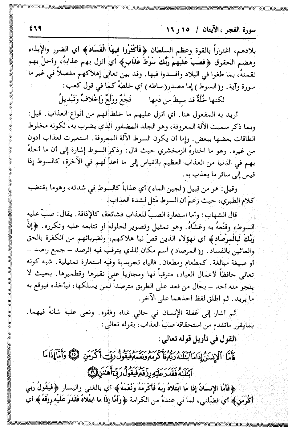 بلادهم، اغترارا بالقوة وعظم السلطان فَأَكْثَرُوا فِيهَا الْفَسادَ أي الضرر والإيذاء وهضم الحقوق فَصَبَّ عَلَيْهِمْ رَبُّكَ سَوْطَ عَذابٍ أي أنزل بهم عذابه، وأحلّ بهم نقمته، بما طغوا في البلاد وأفسدوا فيها. وقد بين تعالى إهلاكهم مفصلا في غير ما سورة وآية. و (السوط) إما مصدر (ساطه) أي خلطه كما في قول كعب: