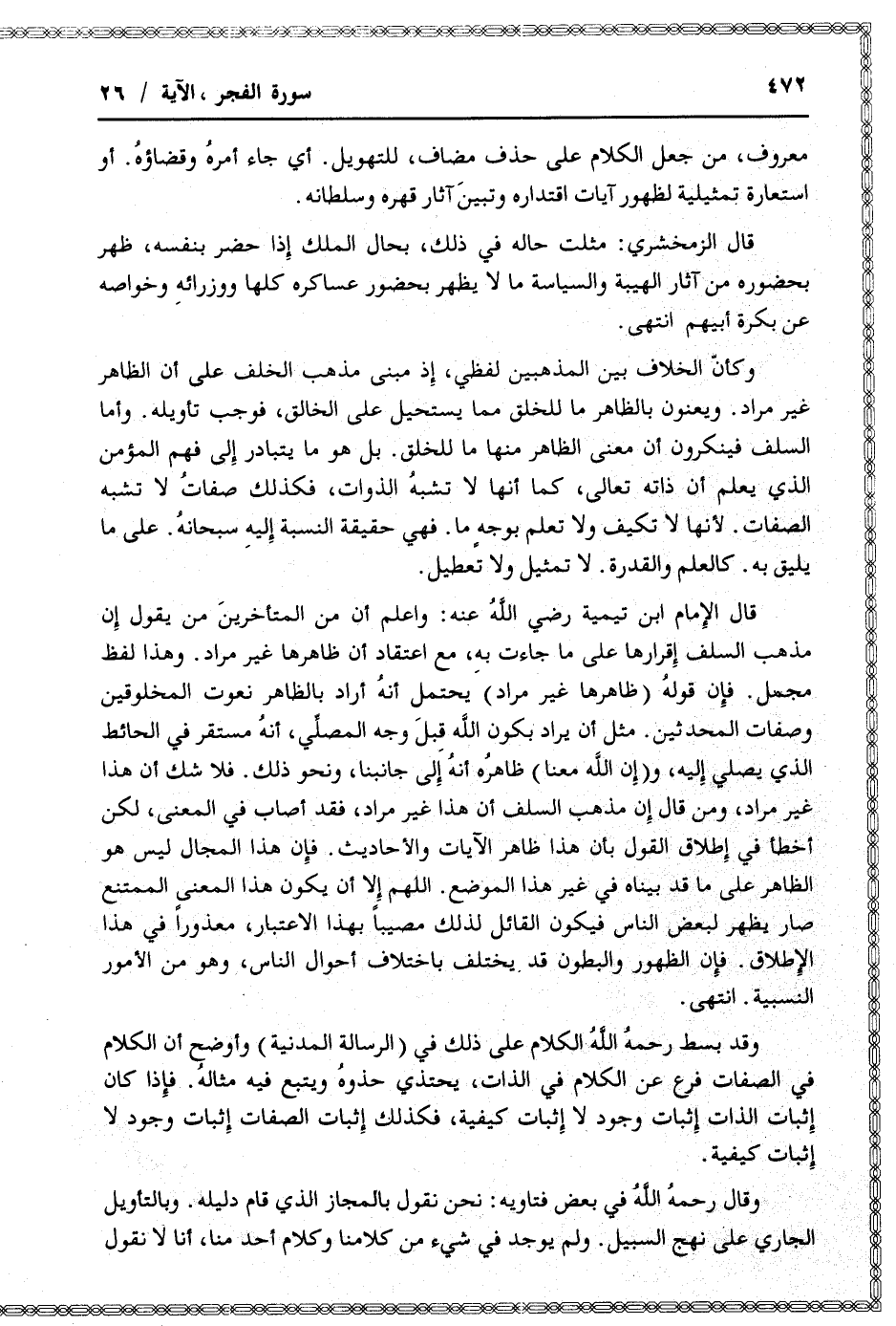 قال الإمام ابن تيمية رضي الله عنه: واعلم أن من المتأخرين من يقول إن مذهب السلف إقرارها على ما جاءت به، مع اعتقاد أن ظاهرها غير مراد. وهذا لفظ مجمل. فإن قوله (ظاهرها غير مراد) يحتمل أنه أراد بالظاهر نعوت المخلوقين وصفات المحدثين. مثل أن يراد بكون الله قبل وجه المصلّي، أنه مستقر في الحائط الذي يصلي إليه، و (إن الله معنا) ظاهره أنه إلى جانبنا، ونحو ذلك. فلا شك أن هذا غير مراد، ومن قال إن مذهب السلف أن هذا غير مراد، فقد أصاب في المعنى، لكن أخطأ في إطلاق القول بأن هذا ظاهر الآيات والأحاديث. فإن هذا المجال ليس هو الظاهر على ما قد بيناه في غير هذا الموضع. اللهم إلا أن يكون هذا المعنى الممتنع صار يظهر لبعض الناس فيكون القائل لذلك مصيبا بهذا الاعتبار، معذورا في هذا الإطلاق. فإن الظهور والبطون قد يختلف باختلاف أحوال الناس، وهو من الأمور النسبية. انتهى.