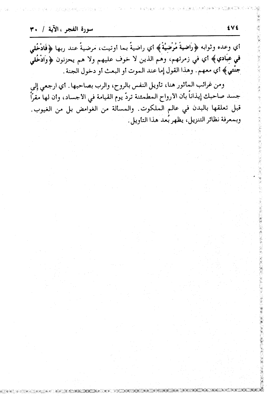 ومن غرائب المأثور هنا، تأويل النفس بالروح، والرب بصاحبها. أي ارجعي إلى جسد صاحبك إيذانا بأن الأرواح المطمئنة تردّ يوم القيامة في الأجساد، وأن لها مقرّا قبل تعلقها بالبدن في عالم الملكوت. والمسألة من الغوامض بل من الغيوب.