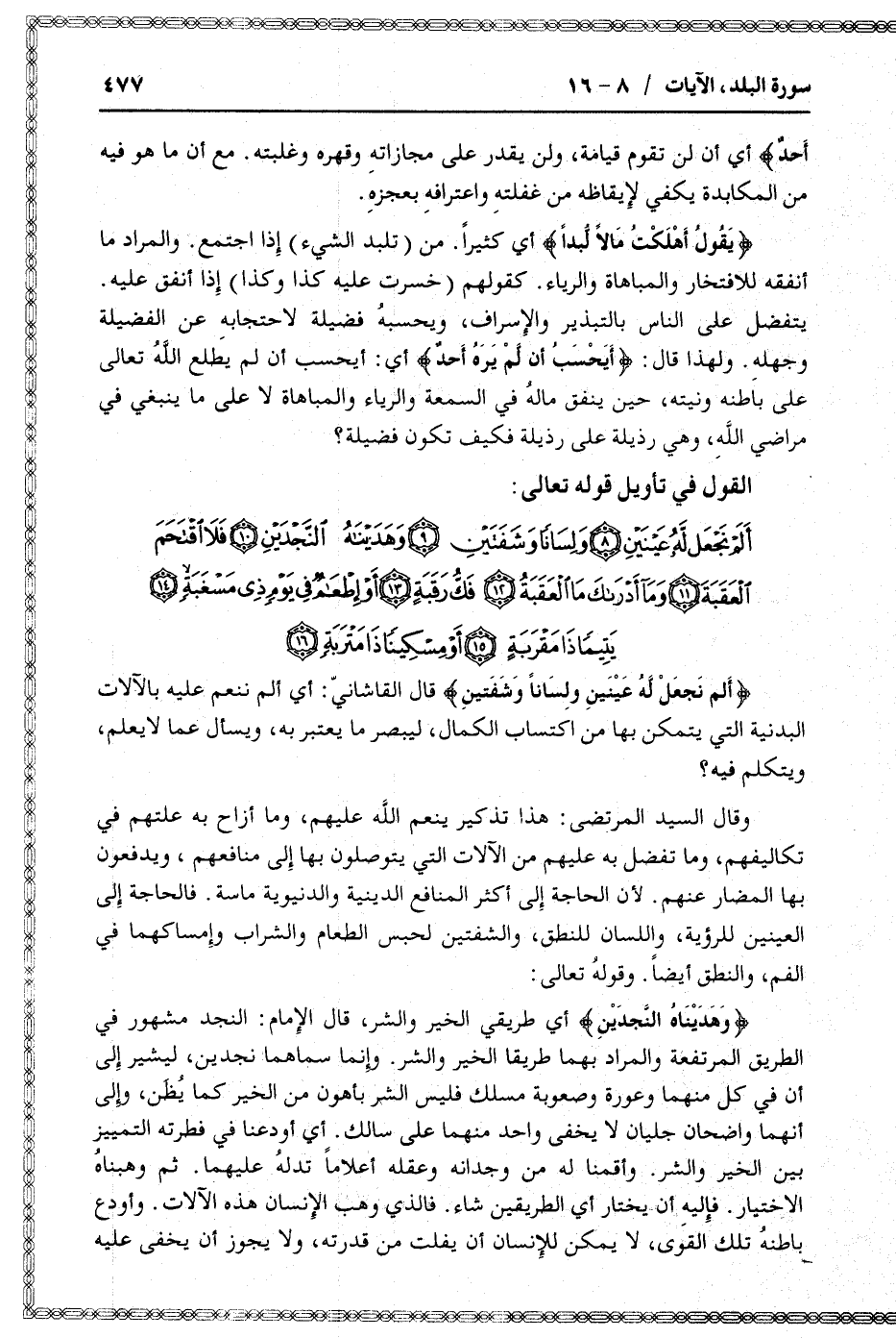 أَلَمْ نَجْعَلْ لَهُ عَيْنَيْنِ (8) وَلِساناً وَشَفَتَيْنِ (9) وَهَدَيْناهُ النَّجْدَيْنِ (10) فَلا اقْتَحَمَ الْعَقَبَةَ (11) وَما أَدْراكَ مَا الْعَقَبَةُ (12)