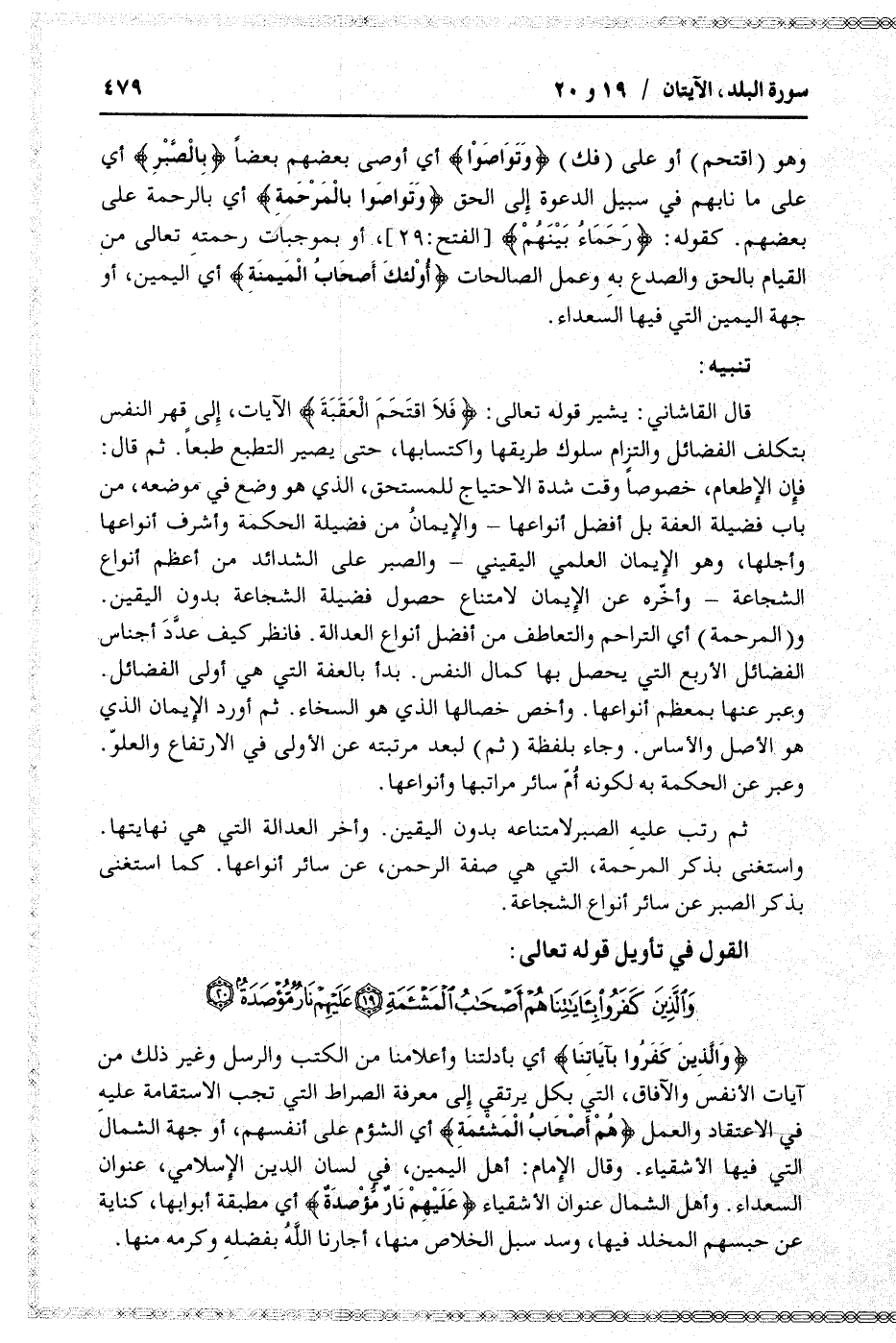 وهو (اقتحم) أو على (فك) وَتَواصَوْا أي أوصى بعضهم بعضا بِالصَّبْرِ أي على ما نابهم في سبيل الدعوة إلى الحق وَتَواصَوْا بِالْمَرْحَمَةِ أي بالرحمة على بعضهم. كقوله: رُحَماءُ بَيْنَهُمْ [الفتح: 29] ، أو بموجبات رحمته تعالى من القيام بالحق والصدع به وعمل الصالحات أُولئِكَ أَصْحابُ الْمَيْمَنَةِ أي اليمين، أو جهة اليمين التي فيها السعداء.