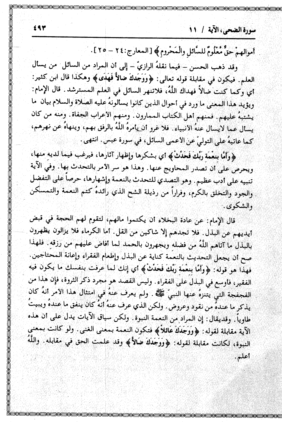 فهذا هو قوله: وَأَمَّا بِنِعْمَةِ رَبِّكَ فَحَدِّثْ أي إنك لما عرفت بنفسك ما يكون فيه الفقير، فأوسع في البذل على الفقراء. وليس القصد هو مجرد ذكر الثروة، فإن هذا من الفجفجة التي يتنزه عنها النبيّ صلى الله عليه وسلم. ولم يعرف عنه في امتثال هذا الأمر أنه كان يذكر ما عنده من نقود وعروض. ولكن الذي عرف عنه أنه كان ينفق ما عنده ويبيت طاويا. وقد يقال: إن المراد من النعمة النبوة. ولكن سياق الآيات يدل على أن هذه الآية مقابلة لقوله: وَوَجَدَكَ عائِلًا فتكون النعمة بمعنى الغنى. ولو كانت بمعنى النبوة، لكانت مقابلة لقوله: وَوَجَدَكَ ضَالًّا وقد علمت الحق في مقابله. والله أعلم.