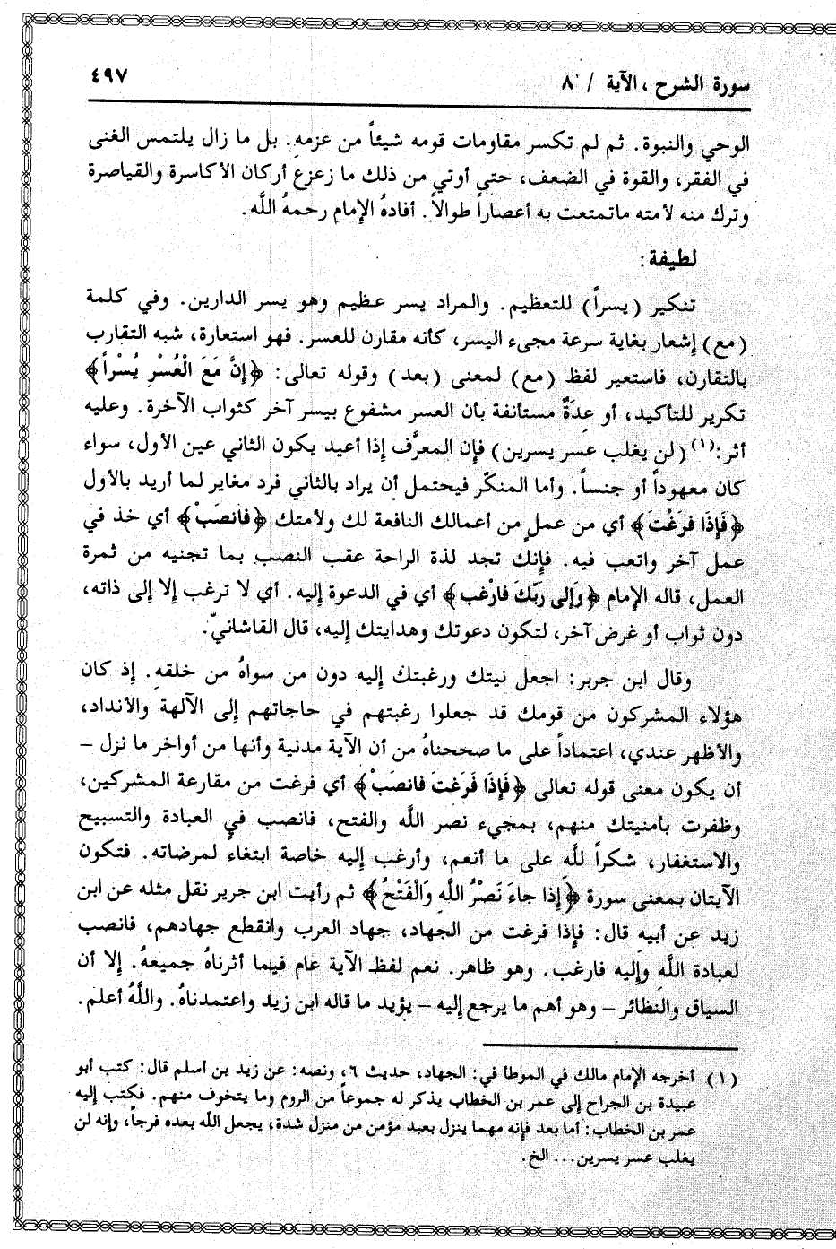 تنكير (يسرا) للتعظيم. والمراد يسر عظيم وهو يسر الدارين. وفي كلمة (مع) إشعار بغاية سرعة مجيء اليسر، كأنه مقارن للعسر. فهو استعارة، شبه التقارب بالتقارن، فاستعير لفظ (مع) لمعنى (بعد) وقوله تعالى: إِنَّ مَعَ الْعُسْرِ يُسْراً تكرير للتأكيد، أو عدة مستأنفة بأن العسر مشفوع بيسر آخر كثواب الآخرة. وعليه أثر: «1» (لن يغلب عسر يسرين) فإن المعرّف إذا أعيد يكون الثاني عين الأول، سواء كان معهودا أو جنسا. وأما المنكّر فيحتمل أن يراد بالثاني فرد مغاير لما أريد بالأول فَإِذا فَرَغْتَ أي من عمل من أعمالك النافعة لك ولأمتك فَانْصَبْ أي خذ في عمل آخر واتعب فيه. فإنك تجد لذة الراحة عقب النصب بما تجنيه من ثمرة العمل، قاله الإمام وَإِلى رَبِّكَ فَارْغَبْ
