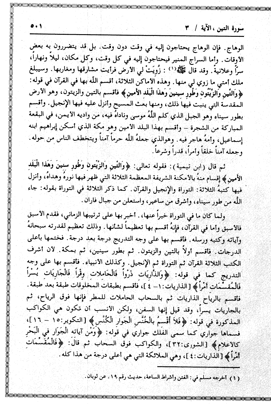ثم قال (ابن تيمية) : فقوله تعالى: وَالتِّينِ وَالزَّيْتُونِ وَطُورِ سِينِينَ وَهذَا الْبَلَدِ الْأَمِينِ إقسام منه بالأمكنة الشريفة المعظمة الثلاثة التي ظهر فيها نوره وهداه، وأنزل فيها كتبه الثلاثة: التوراة والإنجيل والقرآن. كما ذكر الثلاثة في التوراة بقوله: جاء الله من طور سيناء، وأشرق من ساعير، واستعلن من جبال فاران.