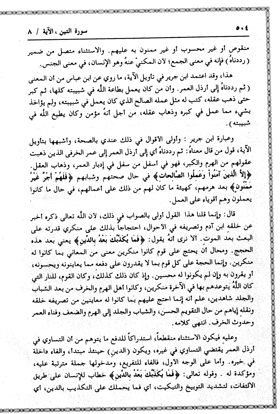 هذا، وقد اعتمد ابن جرير في تأويل الآية، ما روي عن ابن عباس من أن المعنى (ثم رددناه إلى أرذل العمر. وأن من كان يعمل بطاعة الله في شبيبته كلها، ثم كبر حتى ذهب عقله، كتب له مثل عمله الصالح الذي كان يعمل في شبيبته، ولم يؤاخذ بشيء مما عمل في كبره وذهاب عقله، من أجل أنه مؤمن وكان يطيع الله في شبيبته) .