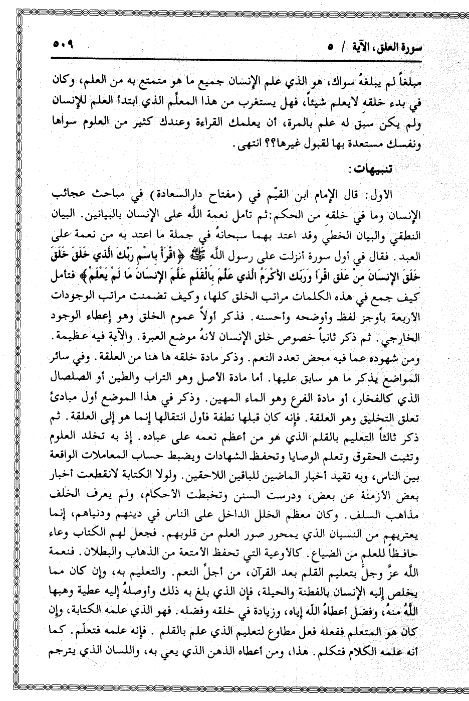 الأول: قال الإمام ابن القيّم في (مفتاح دار السعادة) في مباحث عجائب الإنسان وما في خلقه من الحكم: ثم تأمل نعمة الله على الإنسان بالبيانين. البيان النطقي والبيان الخطي وقد اعتد بهما سبحانه في جملة ما اعتد به من نعمة على العبد. فقال في أول سورة أنزلت على رسول الله صلى الله عليه وسلم اقْرَأْ بِاسْمِ رَبِّكَ الَّذِي خَلَقَ خَلَقَ الْإِنْسانَ مِنْ عَلَقٍ اقْرَأْ وَرَبُّكَ الْأَكْرَمُ الَّذِي عَلَّمَ بِالْقَلَمِ عَلَّمَ الْإِنْسانَ ما لَمْ يَعْلَمْ فتأمل كيف جمع في هذه الكلمات مراتب الخلق كلها، وكيف تضمنت مراتب الوجودات الأربعة بأوجز لفظ وأوضحه وأحسنه. فذكر أولا عموم الخلق وهو إعطاء الوجود الخارجي. ثم ذكر ثانيا خصوص خلق الإنسان لأنه موضع العبرة. والآية فيه عظيمة.